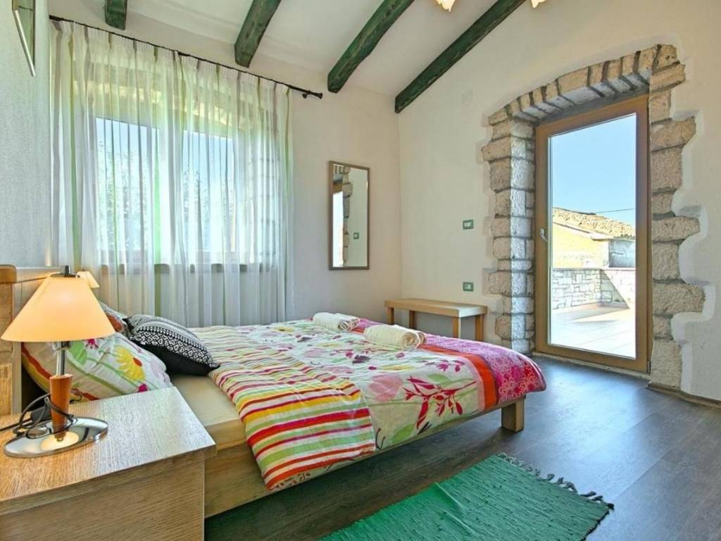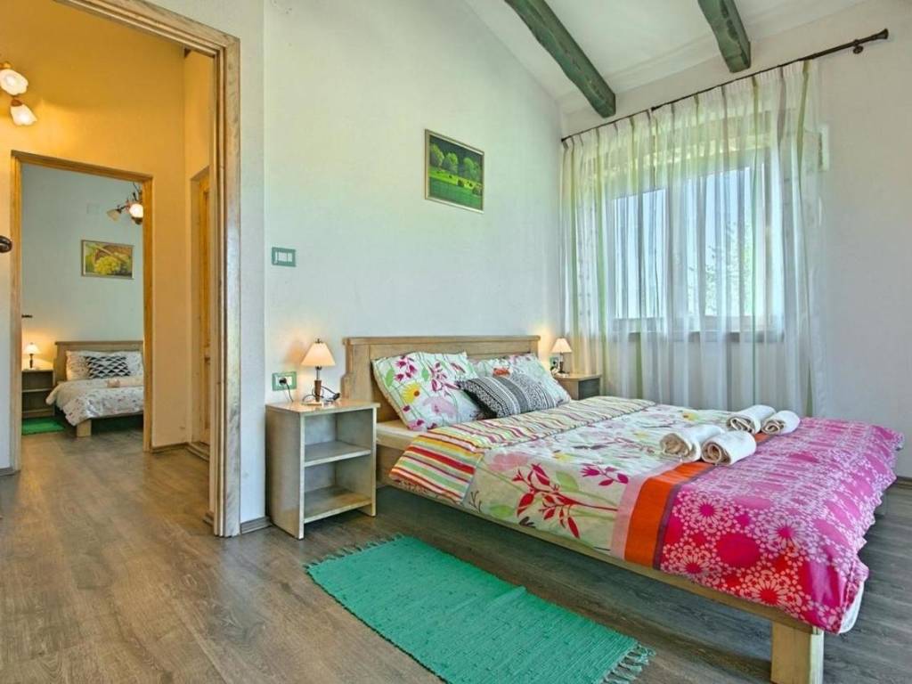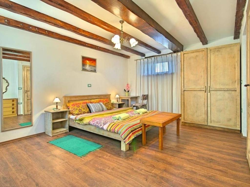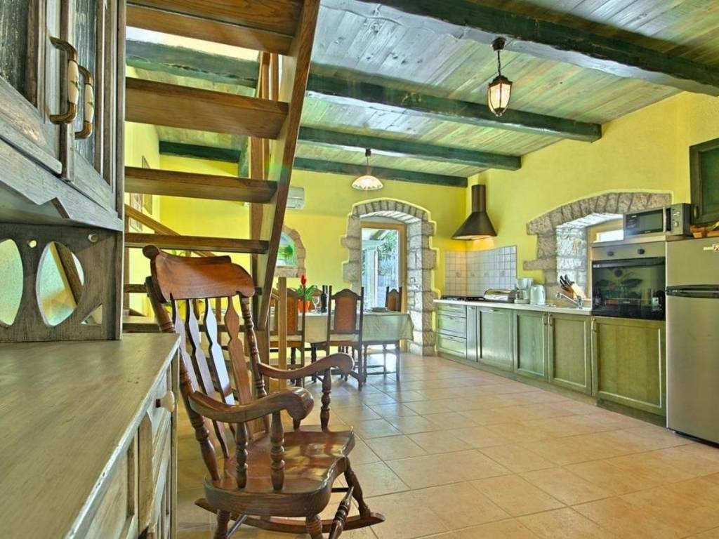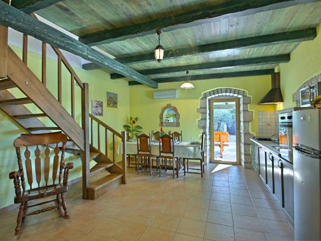 Kuća je površine 103 m² na dvije etaže. U prizemlju kuće nalazi se klimatizirani dnevni boravak sa kaminom i kaučem na izvlačenje za dvije osobe, opremljena kuhinja sa stolom za objedovanje i izlazom na terasu, dvokrevetna spavaća soba sa posebnim izlazom na bazen i vlastitim tuš/WC, odvojeni WC. U potkrovlju se nalazi dvokrevetna spavaća soba sa bračnim krevetom i izlazom na prostranu terasu, dvokrevetna spavaća soba sa dva odvojena ležaja, te tuš/WC.