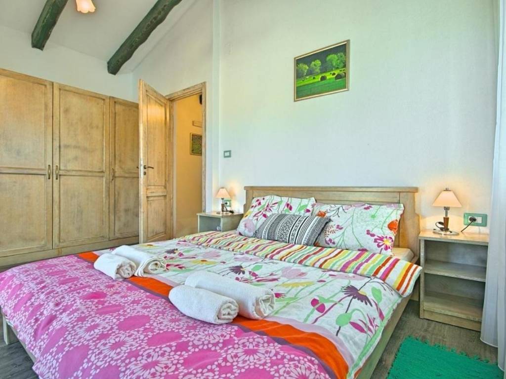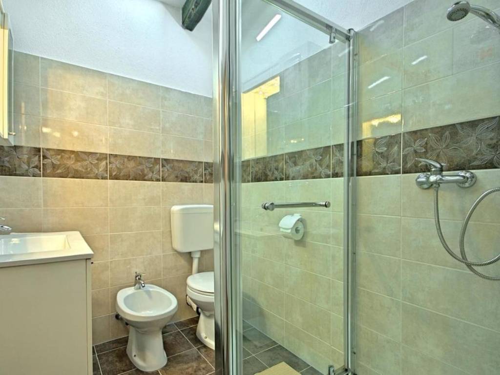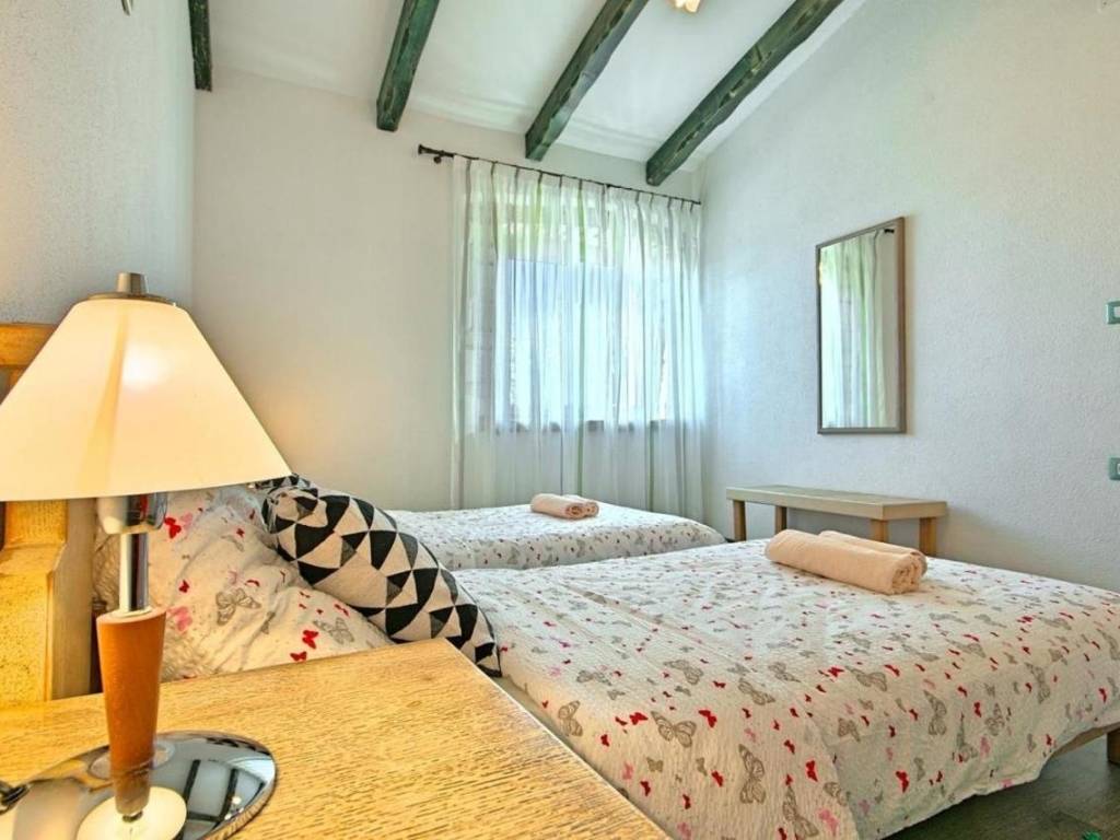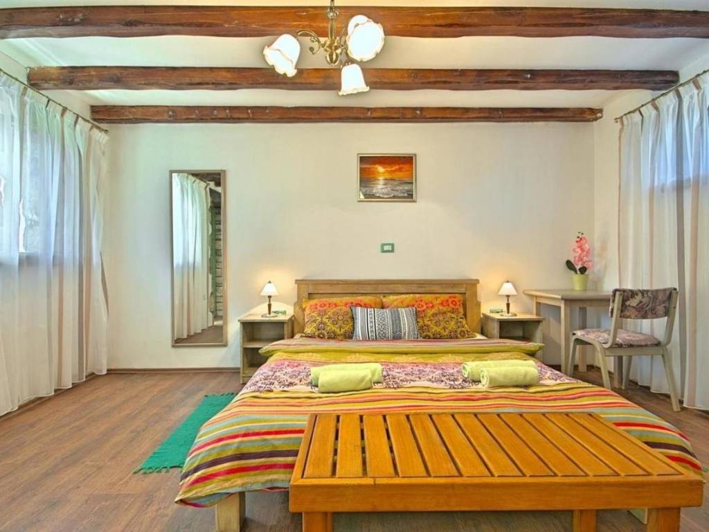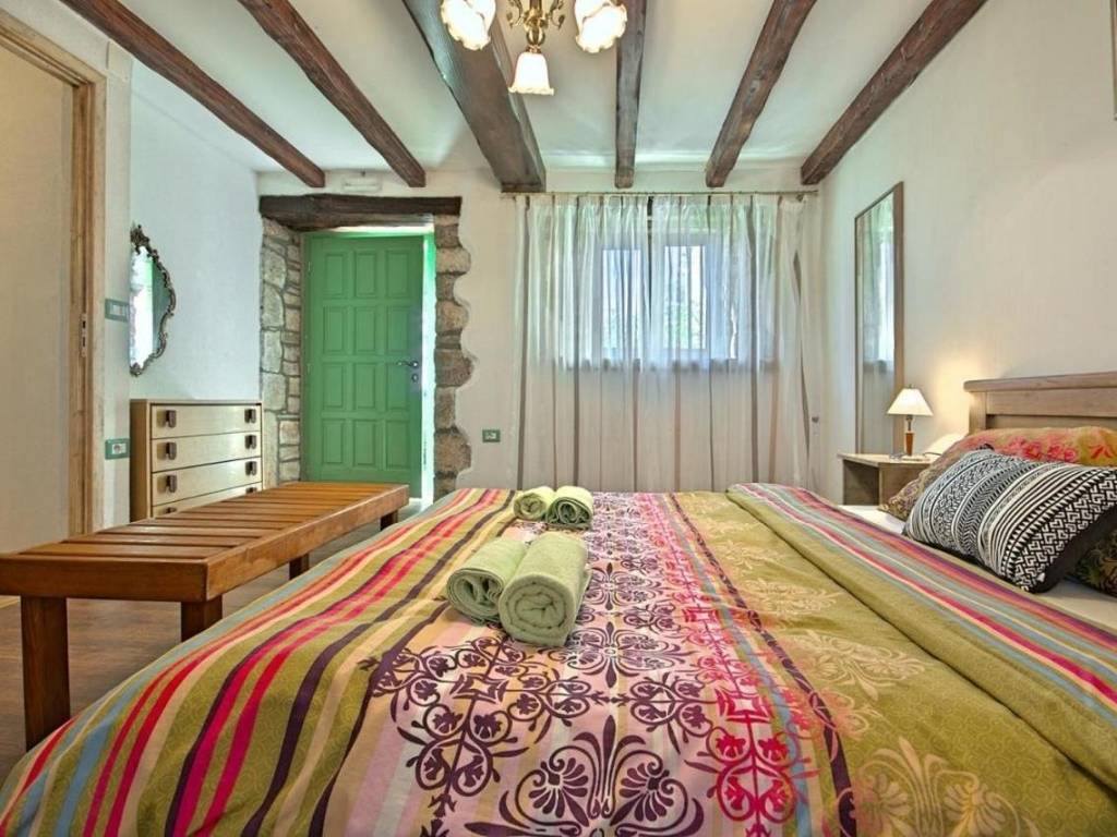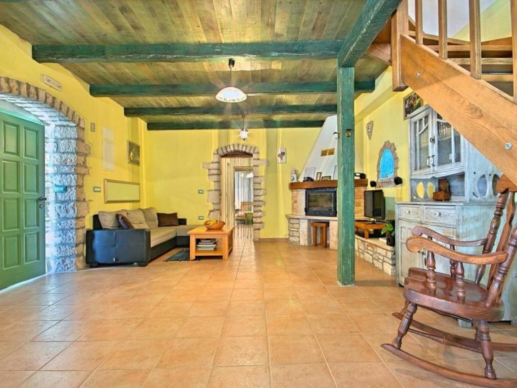 Kuća je površine 103 m² na dvije etaže. U prizemlju kuće nalazi se klimatizirani dnevni boravak sa kaminom i kaučem na izvlačenje za dvije osobe, opremljena kuhinja sa stolom za objedovanje i izlazom na terasu, dvokrevetna spavaća soba sa posebnim izlazom na bazen i vlastitim tuš/WC, odvojeni WC. U potkrovlju se nalazi dvokrevetna spavaća soba sa bračnim krevetom i izlazom na prostranu terasu, dvokrevetna spavaća soba sa dva odvojena ležaja, te tuš/WC.