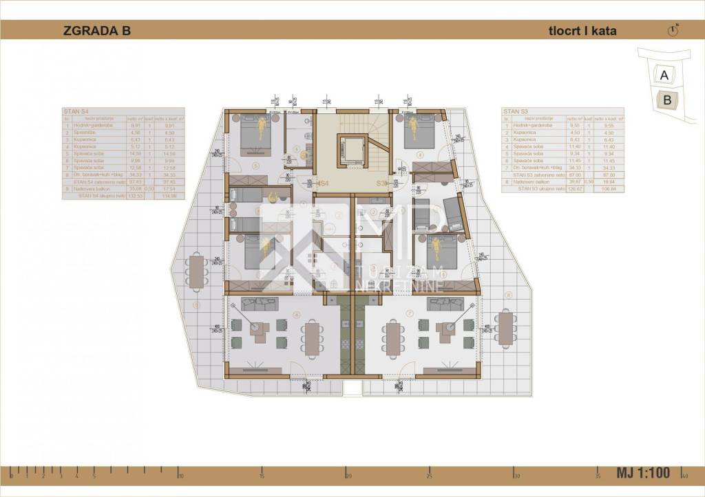 Predmetni stan nalazi se na I. katu zgrade "B", oznake "S3" ukupne korisne površine 106.84 m2. A čine ga hodnik + garderoba, dnevni boravak + kuhinja + blagovaonica, tri spavaće sobe, dvije kupaonice i natkrivena terasa.
