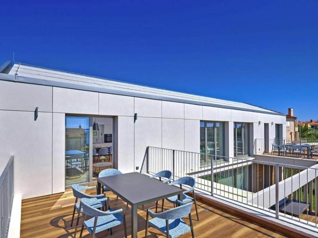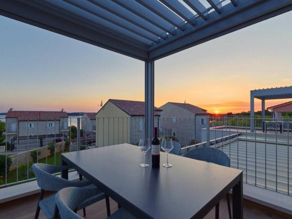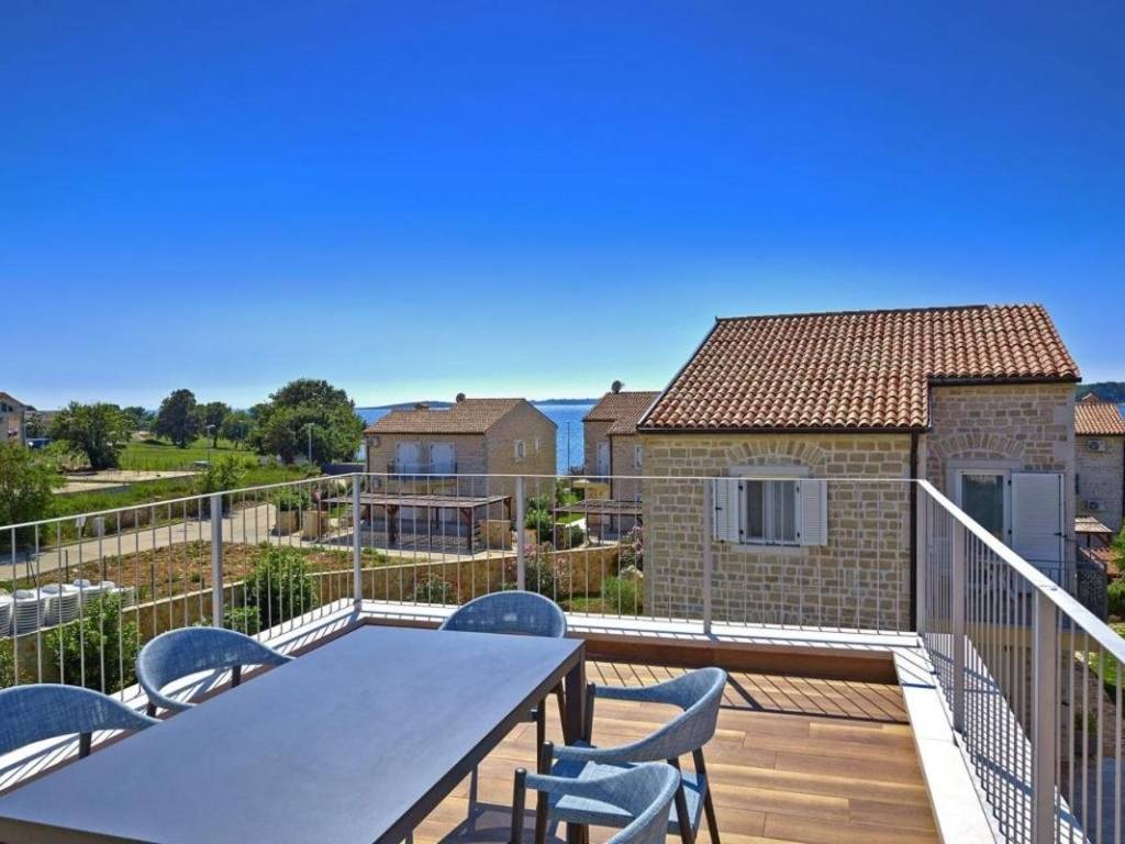 Na prodaju je prekrasna novoizgrađena kuća s 3 luksuzna apartmana u Medulinu, 100m od plaže s prekrasnim pogledom na more.