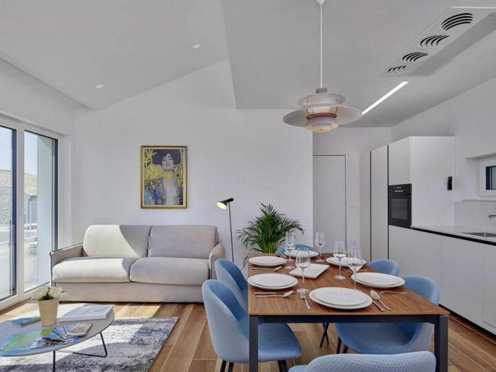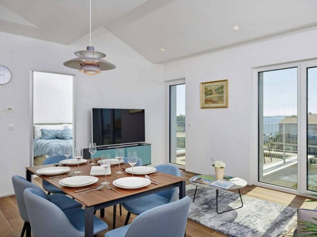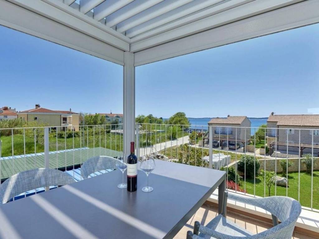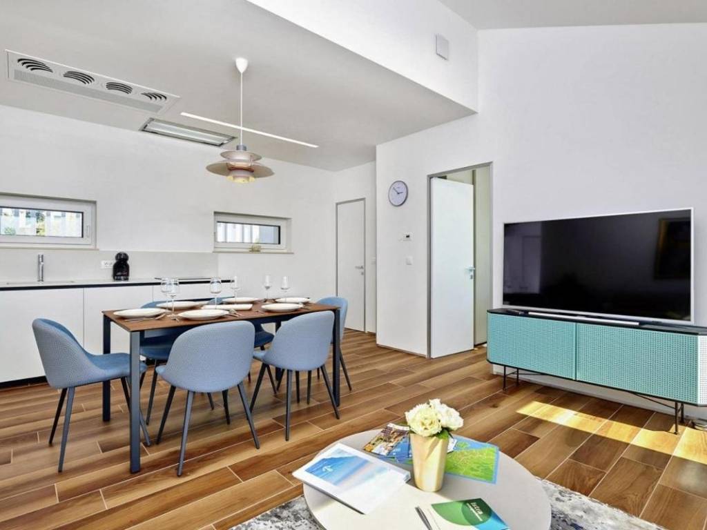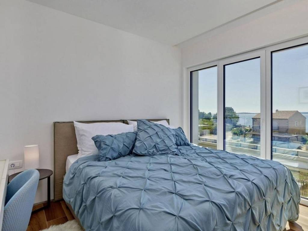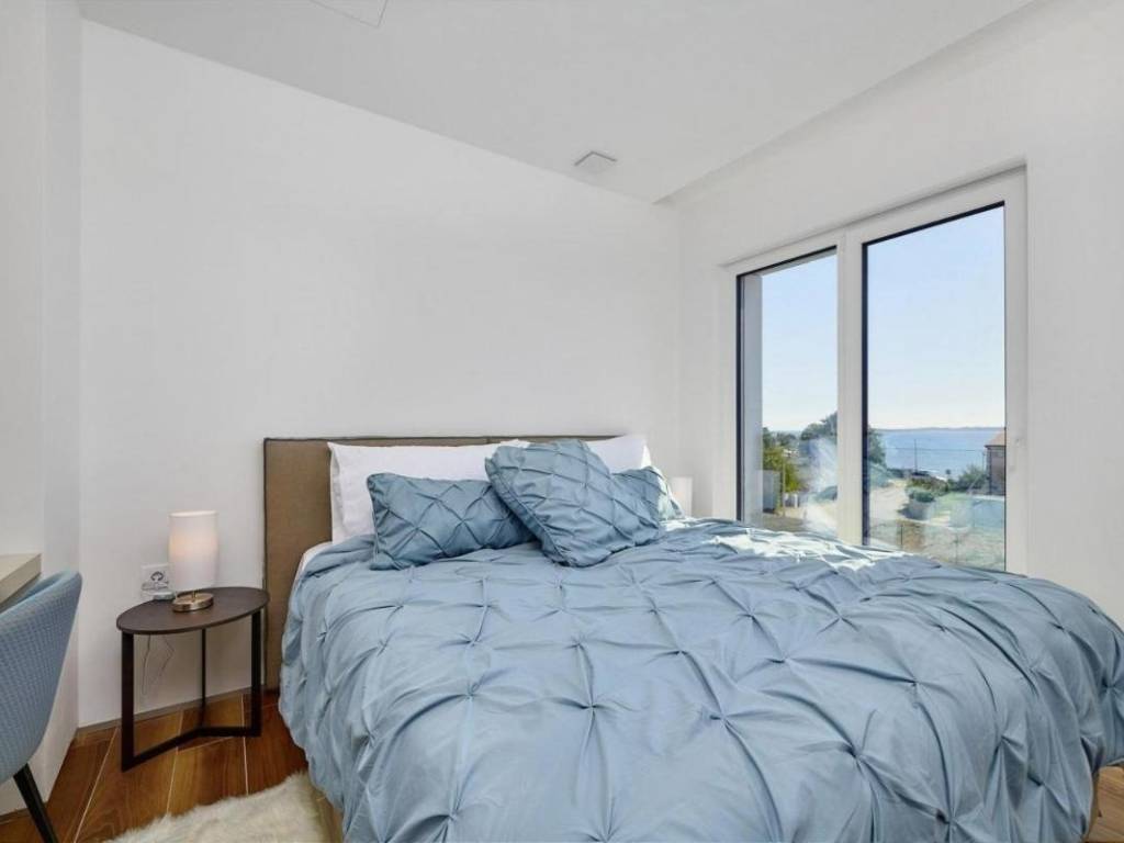 U prizemlju se nalazi veliki apartman od 147,23 m2 koji se sastoji od: ulaznog hodnika, kupaonice, dvije spavaće sobe s vlastitim kupaonicama, ostave, velike prostrane kuhinje s blagovaonicom i dnevnim boravkom s izlazom na prekrasnu terasu gdje se nalazi jacuzzi. U prizemlju kuće se nalazi i kotlovnica s prostorom za bicikle te još jedna ostava koja služi kao vešeraj.Vanjske stepenice vode na kat kuće se nalaze dva odvojena apartmana, kompletno namještena s pogledom na more, ukupne neto korisne površine 102,10 m2. Sastoje se od: kuhinje s blagovaonicom i dnevnim boravkom s izlazom na terasu, kupaonice i jedne spavaće sobe.Kategorizirani su s 4*.Cijela kuća je vrlo dobro opremljena, a sadrži:- dizalicu topline Dimplex, buka vanjske jedinice je minimalna, s daljinskim upravljanjem sistema preko Iphone-a;- postavljeno je podno grijanje u svim prostorijama;- ugrađen sistem rekuperacije koji omogućava ugodan boravak bez otvaranja prozora;- ugrađen sistem brzog zagrijavanja/hlađenja preko dizalice topline;- automatsko isključivanje klime u slučaju otvorenih prozora i vrata;- postavljeni su dodatni radijatori (+ dodatno električno grijanje) u kupaonicama;- postavljene električne vanjske roletne- u objektu je trofazna elektrikaKuća je smještena u mirnom dijelu unutar ograđene okućnice gdje postoji mogućnost izgradnje bazena. Namještena je i opremljena s vrhunskim materijalima te se takva i prodaje.Kuća posjeduje svu dokumentaciju te se prodaje zajedno s firmom d.o.o.