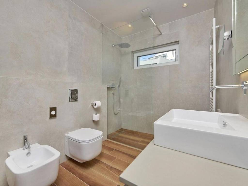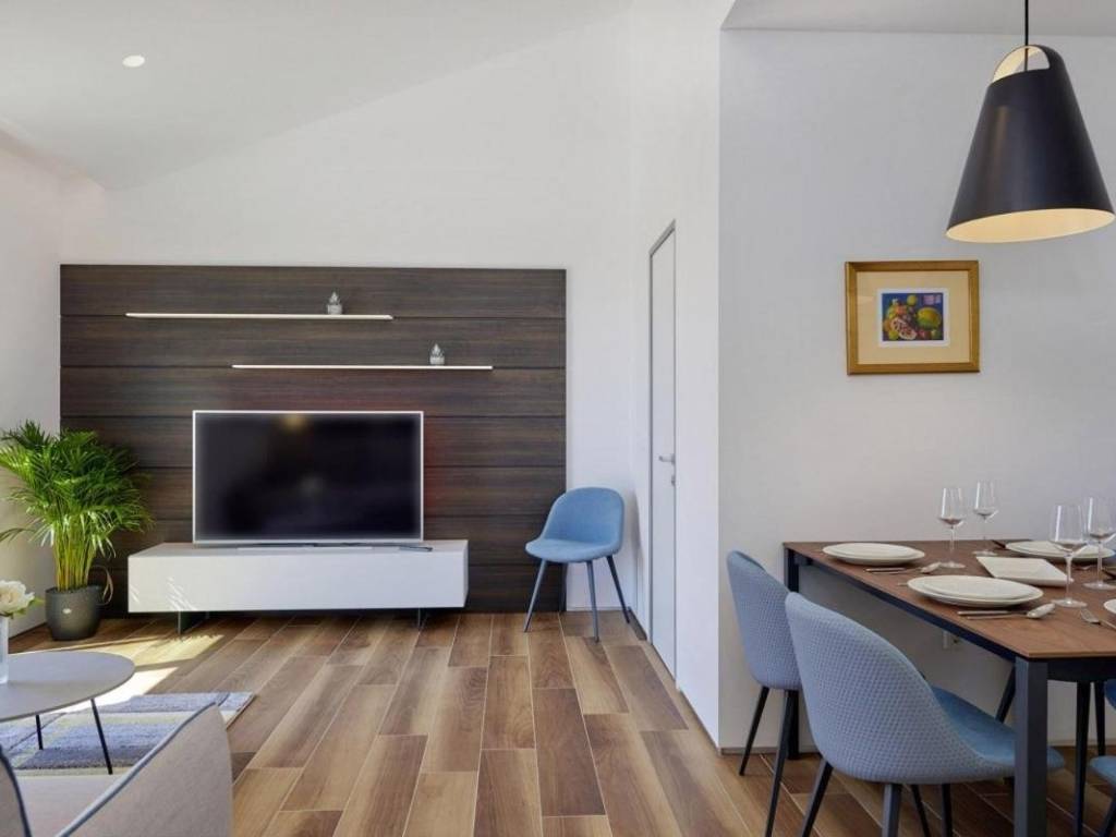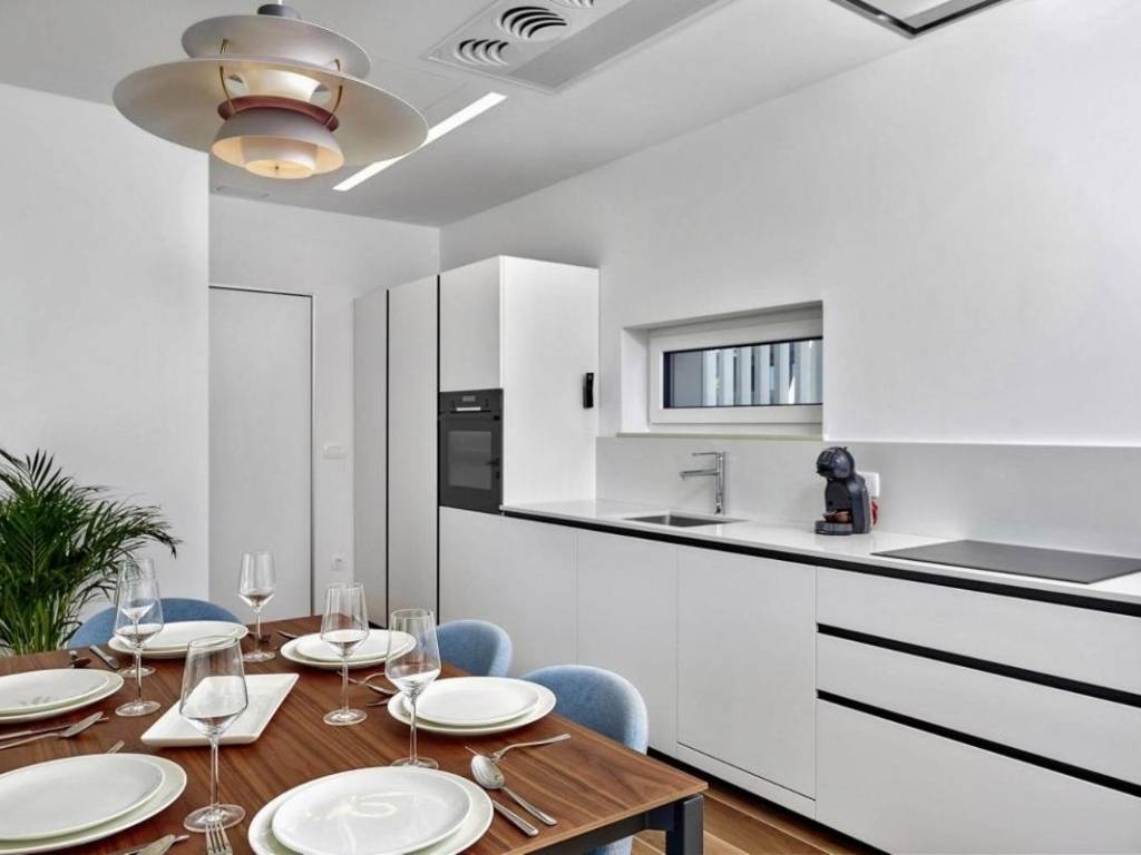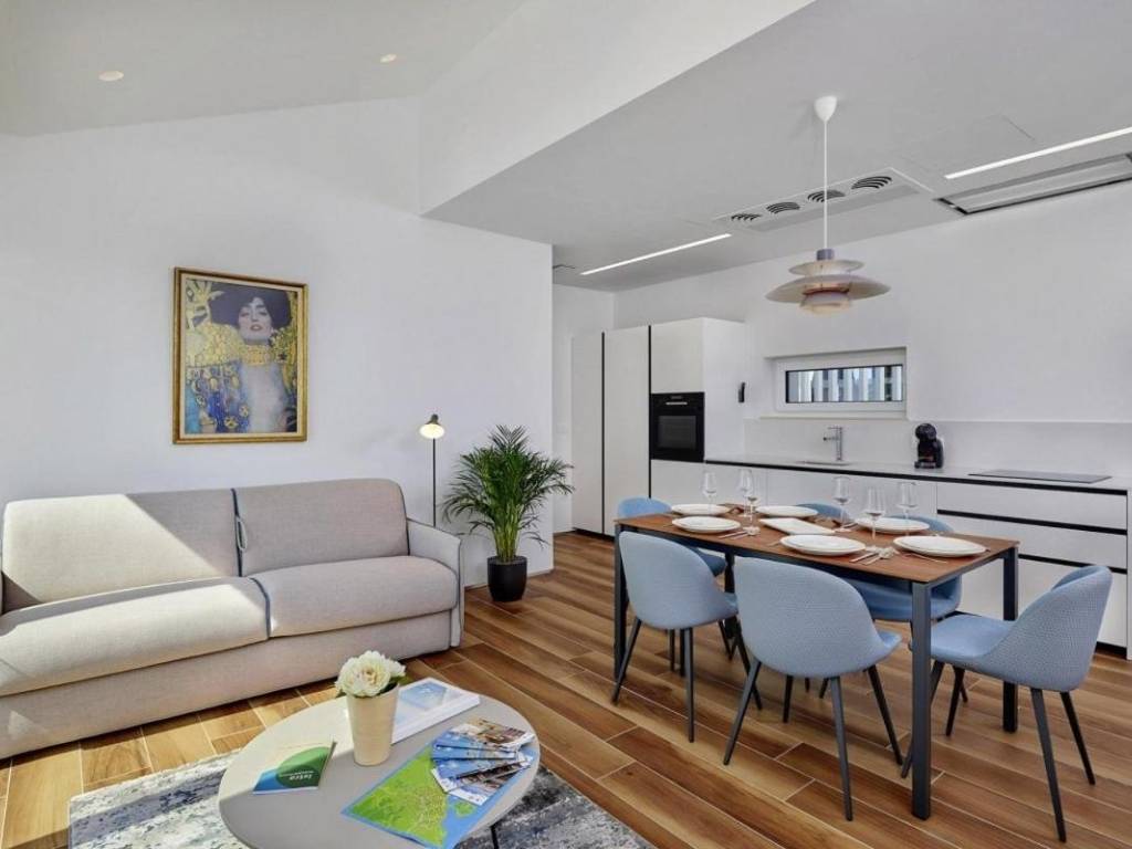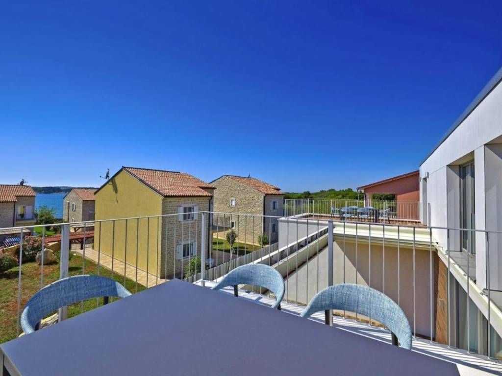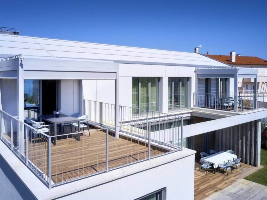 U prizemlju se nalazi veliki apartman od 147,23 m2 koji se sastoji od: ulaznog hodnika, kupaonice, dvije spavaće sobe s vlastitim kupaonicama, ostave, velike prostrane kuhinje s blagovaonicom i dnevnim boravkom s izlazom na prekrasnu terasu gdje se nalazi jacuzzi. U prizemlju kuće se nalazi i kotlovnica s prostorom za bicikle te još jedna ostava koja služi kao vešeraj.Vanjske stepenice vode na kat kuće se nalaze dva odvojena apartmana, kompletno namještena s pogledom na more, ukupne neto korisne površine 102,10 m2. Sastoje se od: kuhinje s blagovaonicom i dnevnim boravkom s izlazom na terasu, kupaonice i jedne spavaće sobe.Kategorizirani su s 4*.Cijela kuća je vrlo dobro opremljena, a sadrži:- dizalicu topline Dimplex, buka vanjske jedinice je minimalna, s daljinskim upravljanjem sistema preko Iphone-a;- postavljeno je podno grijanje u svim prostorijama;- ugrađen sistem rekuperacije koji omogućava ugodan boravak bez otvaranja prozora;- ugrađen sistem brzog zagrijavanja/hlađenja preko dizalice topline;- automatsko isključivanje klime u slučaju otvorenih prozora i vrata;- postavljeni su dodatni radijatori (+ dodatno električno grijanje) u kupaonicama;- postavljene električne vanjske roletne- u objektu je trofazna elektrikaKuća je smještena u mirnom dijelu unutar ograđene okućnice gdje postoji mogućnost izgradnje bazena. Namještena je i opremljena s vrhunskim materijalima te se takva i prodaje.Kuća posjeduje svu dokumentaciju te se prodaje zajedno s firmom d.o.o.