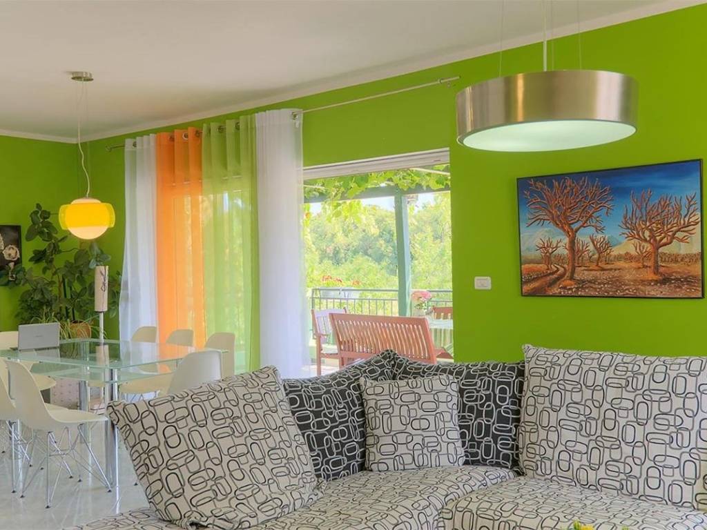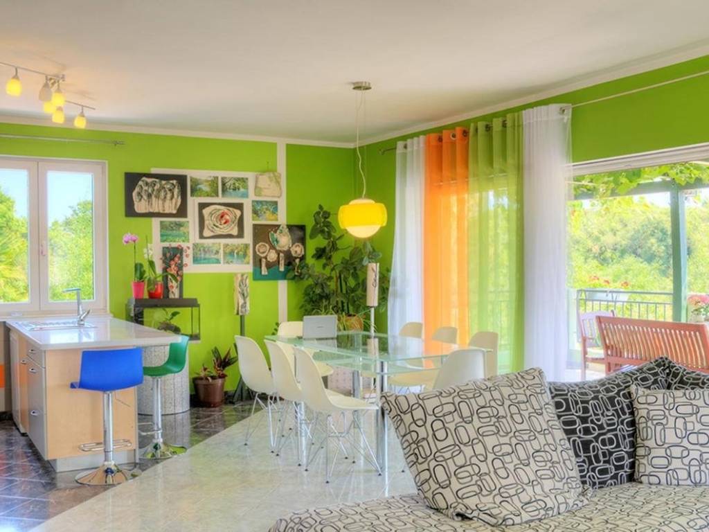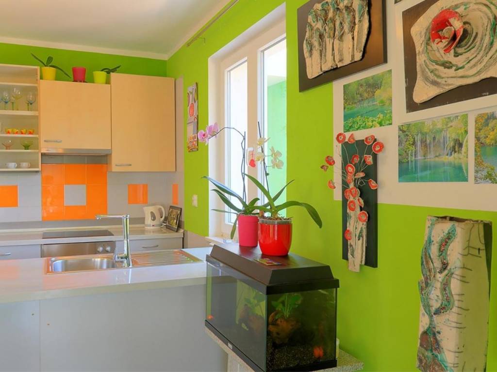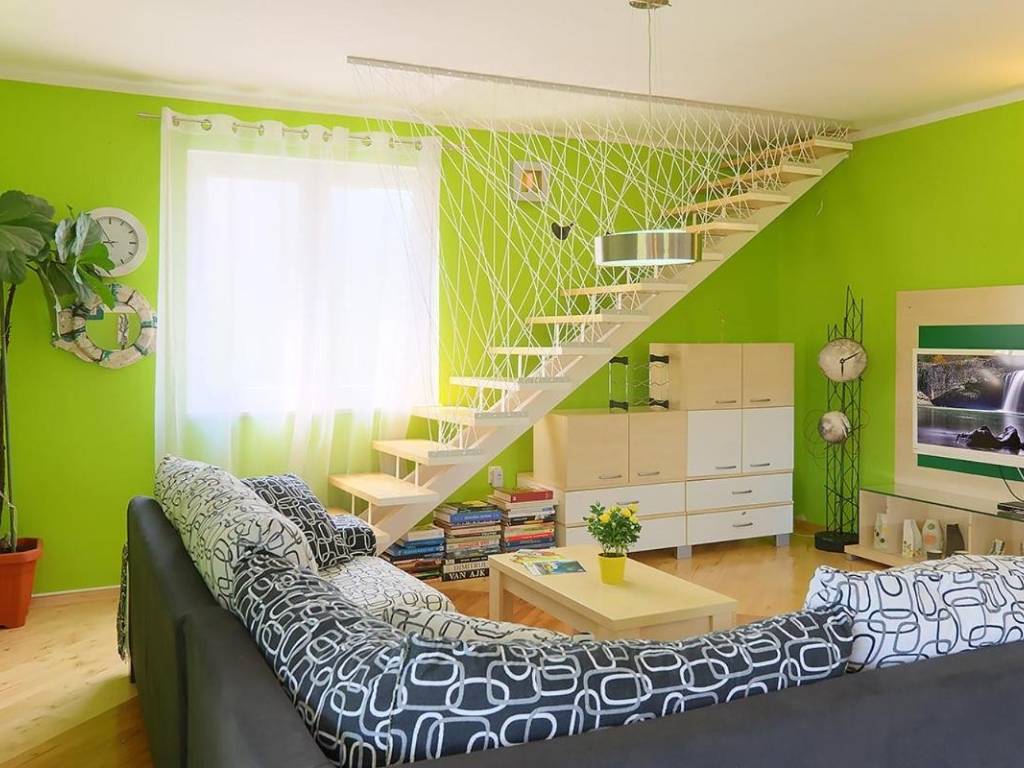 povezane s dnevnim boravkom i terase. Na 1. katu se nalazi stan koji sesastoji od dnevnog boravka, kuhinje, 2 spavaće sobe i kupaone.