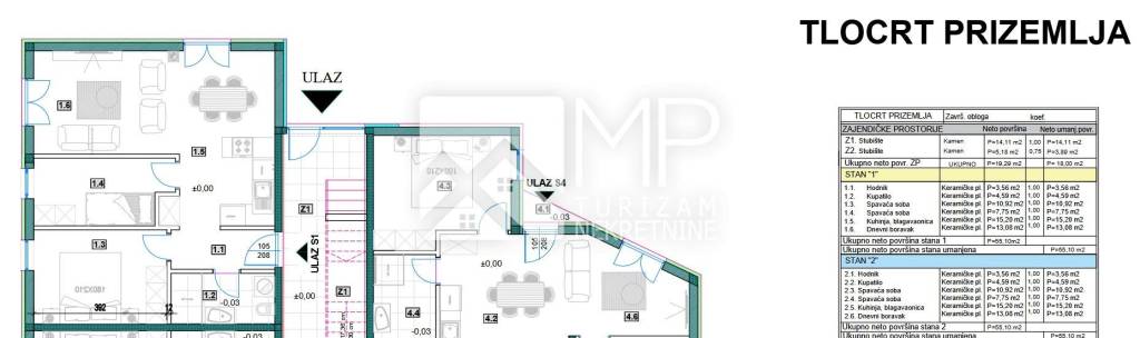 Stan „S1“ nalazi se u prizemlju zgrade površine 55,10m2 , a sastoji se od: hodnika, kupaonice, dvije spavaće sobe, kuhinje i blagovaonice, dnevnog boravka s izlazom na vrt površine 31,87 m2.