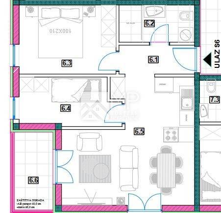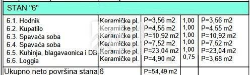 Stan „S6“ nalazi se na prvom katu zgrade površine 54,49 m2 , a sastoji se od: hodnika, kupaonice, dvije spavaće sobe, kuhinje i blagovaonice, dnevnog boravka s izlazom na loggiu.