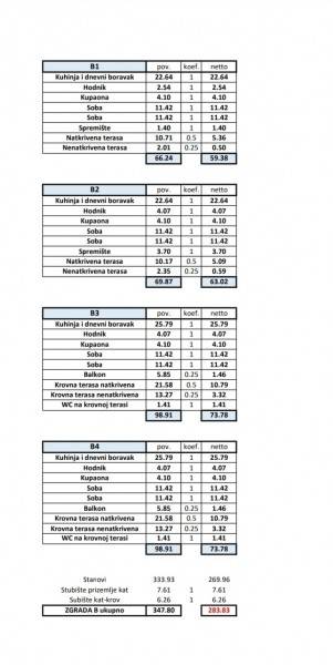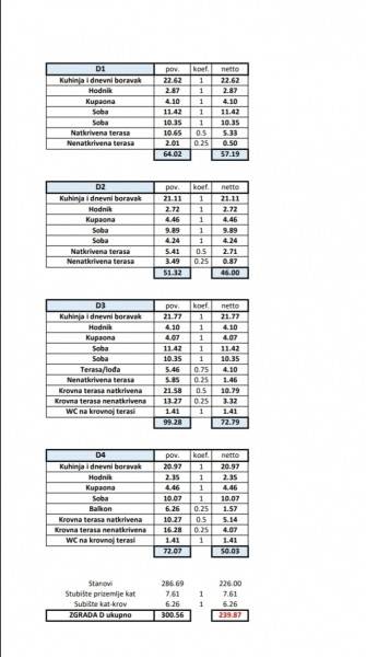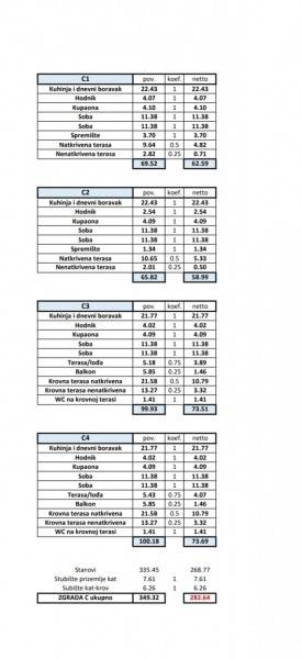 Po tipu su dvosobni stanovi od 62 m2 i 66 m2.. svaki stan u prizemlju ima dio zemljišta u vlasništvu ,cca od 40 m2 do 150 m2 , što če biti definirano na kraju izgradnje zgrade.