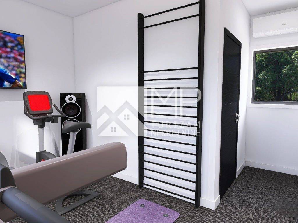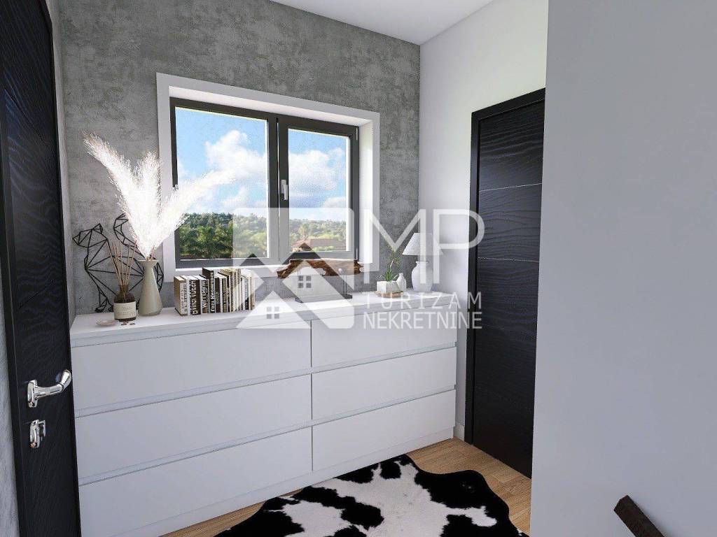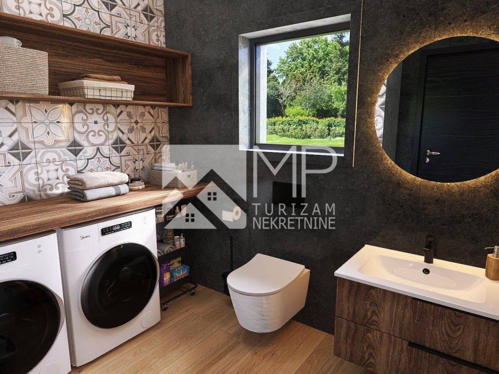 - prizemlje: ulazni hodnik, wc, ostava, kotlovnica, veliki open space prostor s kuhinjom, blagovaonicom i dnevnim boravkom s izlazom na terasu, jedna spavaća soba s vlastitom kupanicom