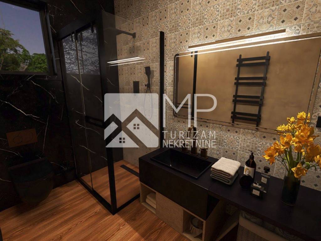 Vila će biti opremljena kvalitetnom PVC stolarijom sa roletama, keramikom većih formata, vrhunskim sanitarijama, podnim grijanjem 12 V, klima uređajima i instalacijom za kamere.
