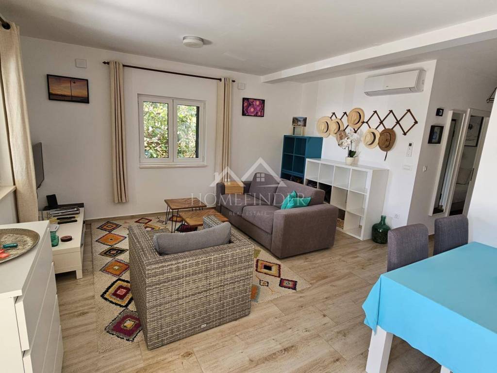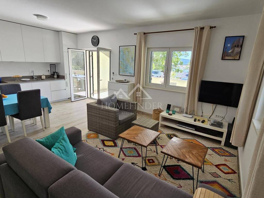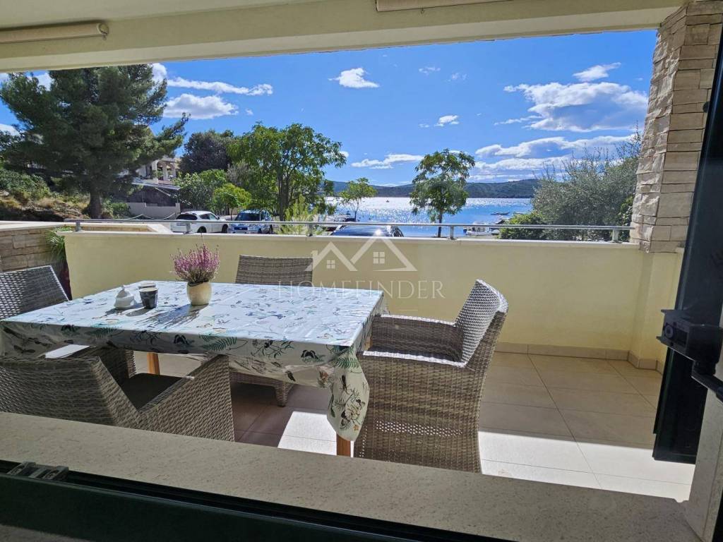 Na prodaju je moderan, potpuno namješten dvosoban stan smješten prvi red do mora, na mirnoj i prestižnoj lokaciji idealnoj za opuštanje i uživanje u čarima Jadrana.