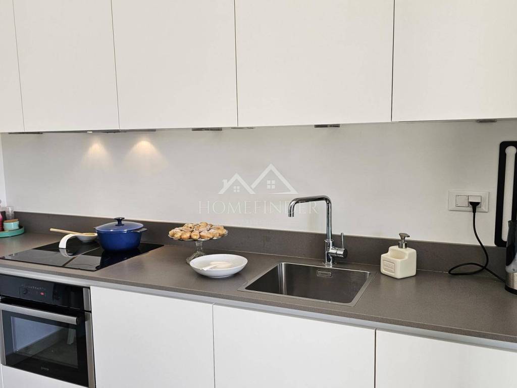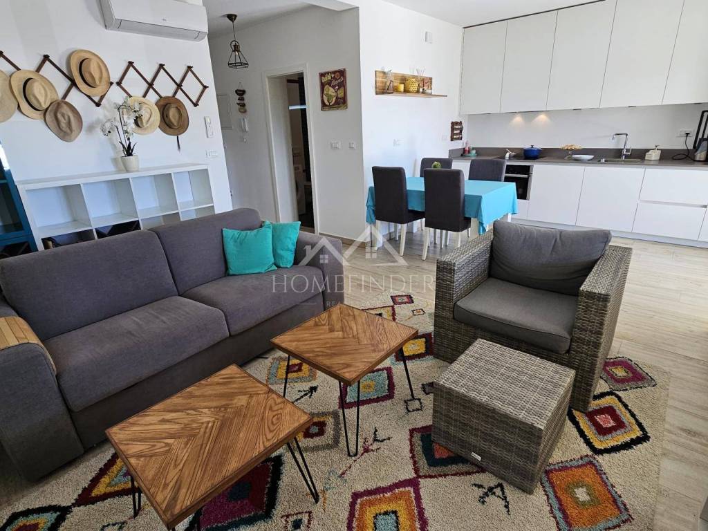 Stan ima ukupnu neto površinu od 80 m2 I sastoji se od dvije udobne spavaće sobe, elegantne kupaonice te otvorenog prostora s kuhinjom, blagovaonicom i dnevnim boravkom. Iz dnevnog boravka izlazi se na veliku natkrivenu terasu/loggiu savršenu za jutarnju kavu ili večernje opuštanje uz predivan pogled na more.
