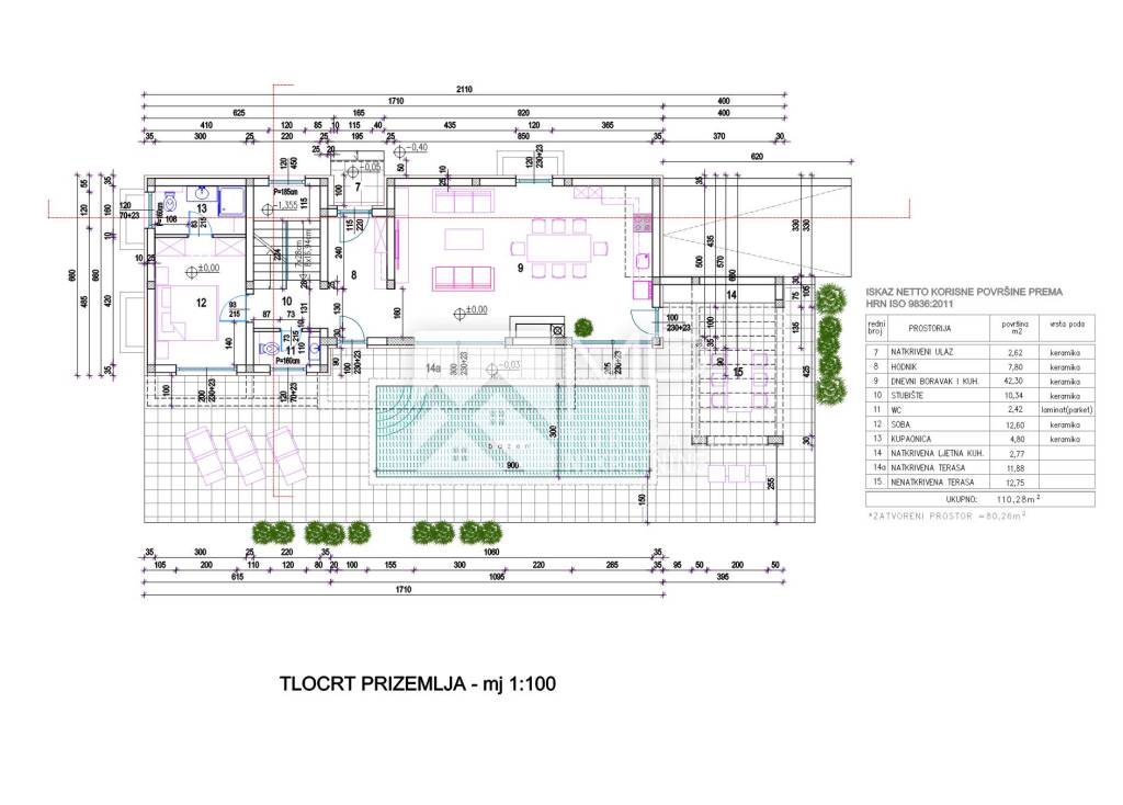 Pored kuće planiran je ukopan bazen, čija je ukupna bruto površina 33,25m2, dok je vodena površina bazena 27m2.
