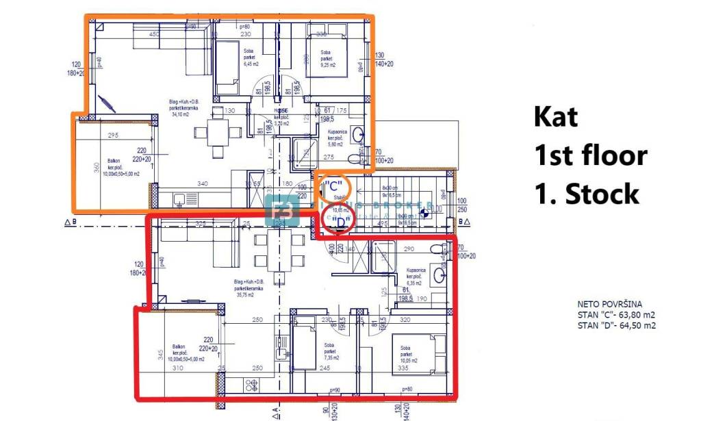 Stan C nalazi se na 1. katu ukupne korisne površine 63,80 m2 (stambena površina 68,80 m2) + parking. Stan se sastoji od ulaznog pred prostora, hodnika, dvije spavaće sobe, kupaonice, prostranog dnevnog boravka, kuhinje s blagovaonicom koja ima izlaz na terasu površine 10 m2 s koje se pruža lijepi pogled na more. Stanu pripada jedno parkirno mjesto.