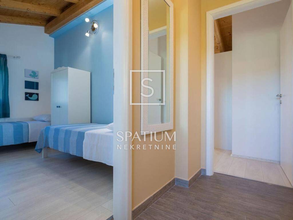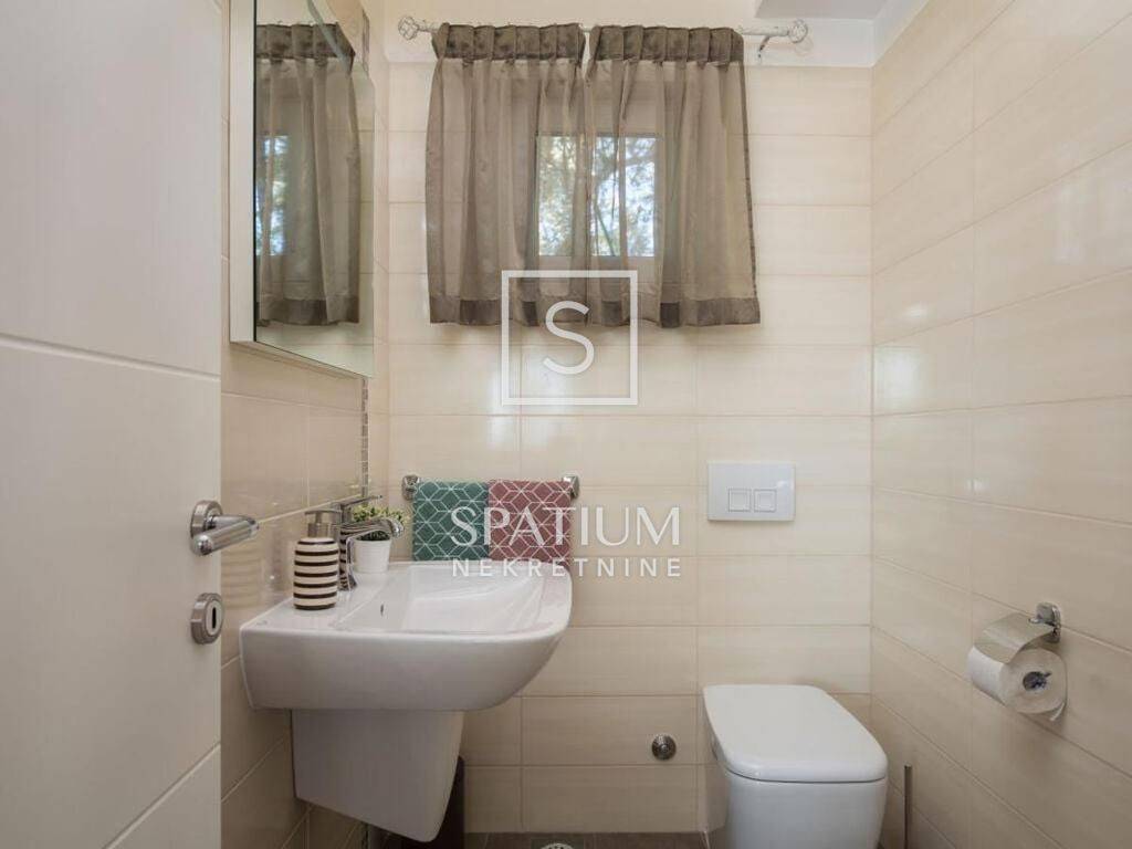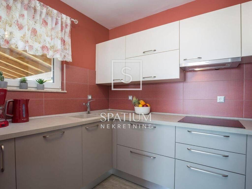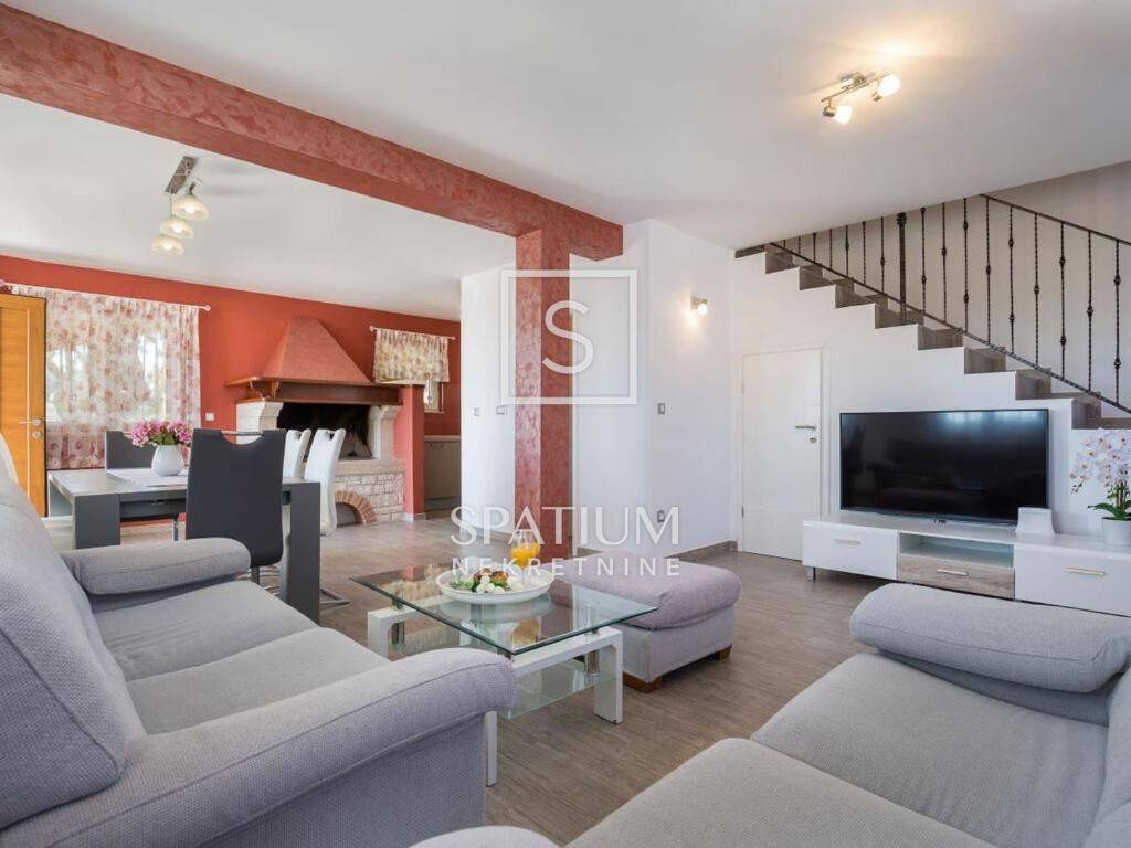 Unutar uređene i ograđene okućnice nalaze se bazen sa sunčalištem, roštilj, prostor za druženje, parkirni prostor za više vozila, podrum i garaža te zelena površina. Nalazi se u mirnom dijelu, udaljena 700 m od zračne linije, mora i centra.