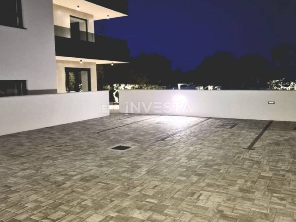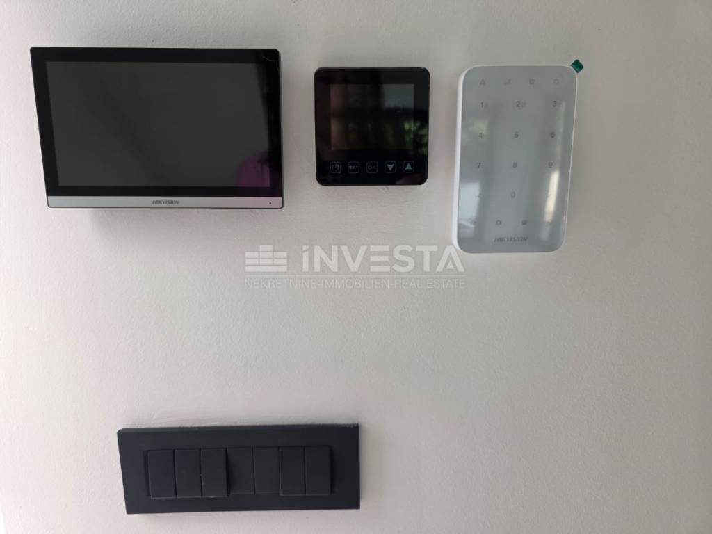 Vila je tehnički opremljena tako da pruža potpunu kontrolu i sigurnost: podno grijanje u svim prostorijama, klima uređaji u svakoj sobi, antracit stolarija s električnim roletama i komarnicima, kolektor za toplu vodu, video portafon, videonadzor, alarmni sustav, kao i pametni sustav upravljanja cijelim domom. Pristup kući osiguran je električnom kapijom, a na raspolaganju su i privatna garaža te dva vanjska parkirna mjesta.