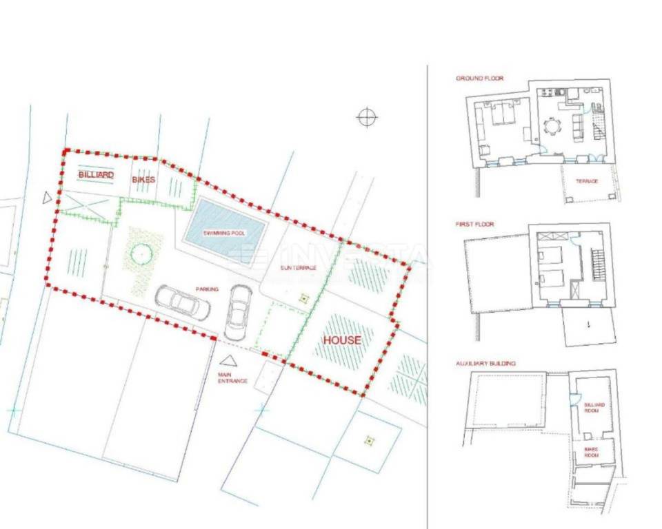 Uz sam apartman unutar posjeda nalaze se tri prostora, prvi je opremljen biljarskim stolom, drugi prostor koristi se kao spremište koji ima pripremu za tuš i WC i svoju septičku koje je direktno spojena sistemom preljeva u glavnu septičku jamu i izoliran prostor strojarnice bazena, opremljen elektrolizom kompletni sustav je automatiziran.