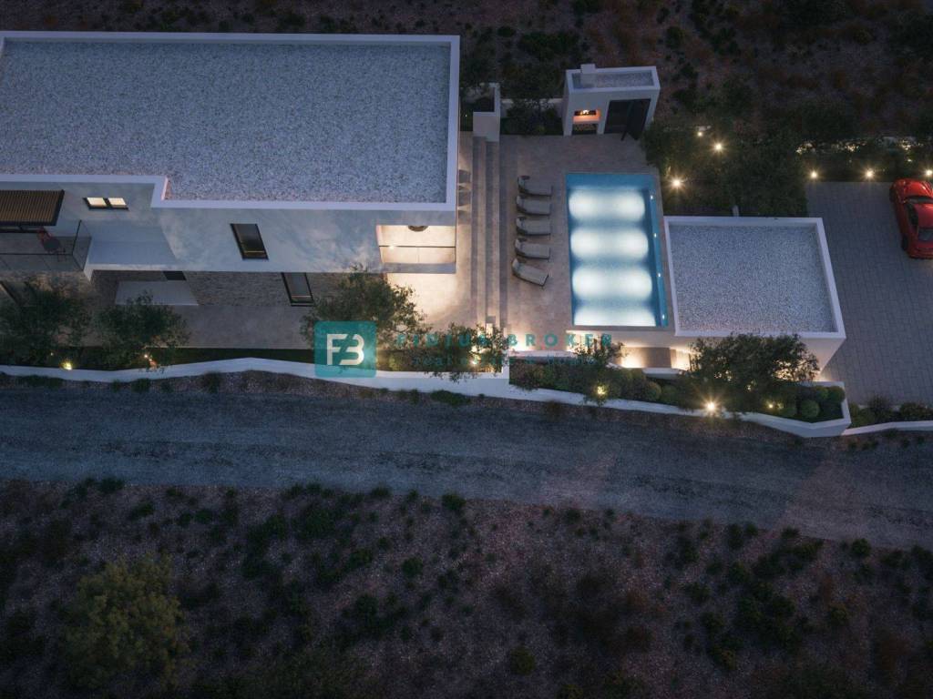 Namještena vila ukupne neto korisne površine 304,1 m2 + bazen 32 m2 + garaža 35 m2 + parking + dvorište izgrađena je na zemljištu površine 720 m2 i ima dvije etaže: prizemlje + kat. U prizemlju stambene površine 127 m2 nalazi se prostrani dnevni dio otvorenog koncepta koji se sastoji od kuhinje, blagovaonice i dnevnog boravka s izlazom na veliku natkrivenu terasu površine 28,01 m2 i grijani bazen površine 32 m2, sunčalište te ljetna kuhinja. Na istoj etaži smješteni su hodnik, jedna spavaća soba, dodatna prostorija koja može služiti kao radna soba ili gostinjska soba, ovisno o potrebama budućih vlasnika te kupaonica. Unutarnje stubište vodi na kat stambene površine 128,60 m2 s tri moderno uređene spavaće sobe, svaka s vlastitom kupaonicom. Dvije sobe imaju izlaz na natkrivenu terasu površine 23,01 m2 s koje se pruža panoramskim pogledom na more i otoke, dok treća soba ima balkonom površine 6,29 m2 s kojeg se također pruža lijepi pogled na more. Na katu se nalazi i praonica.