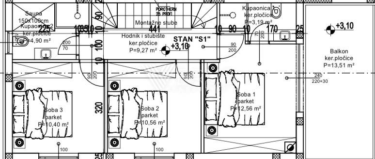Na katu se nalaze tri spavaće sobe, dvije kupaonice te natkriveni balkon od 13,5 m² s pogledom na more. Glavna spavaća soba ima mogućnost ugradnje privatne saune, što cijelom prostoru daje dodatnu dozu ekskluzivnosti.