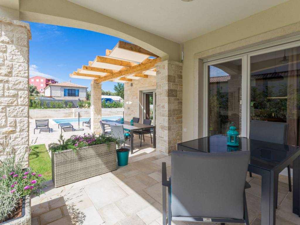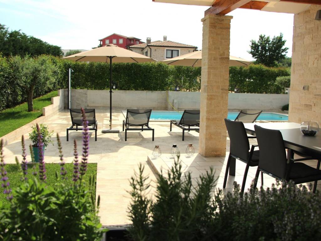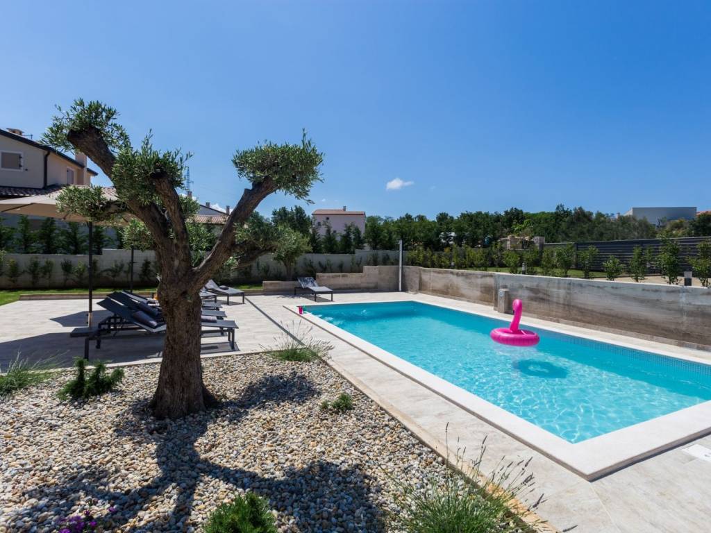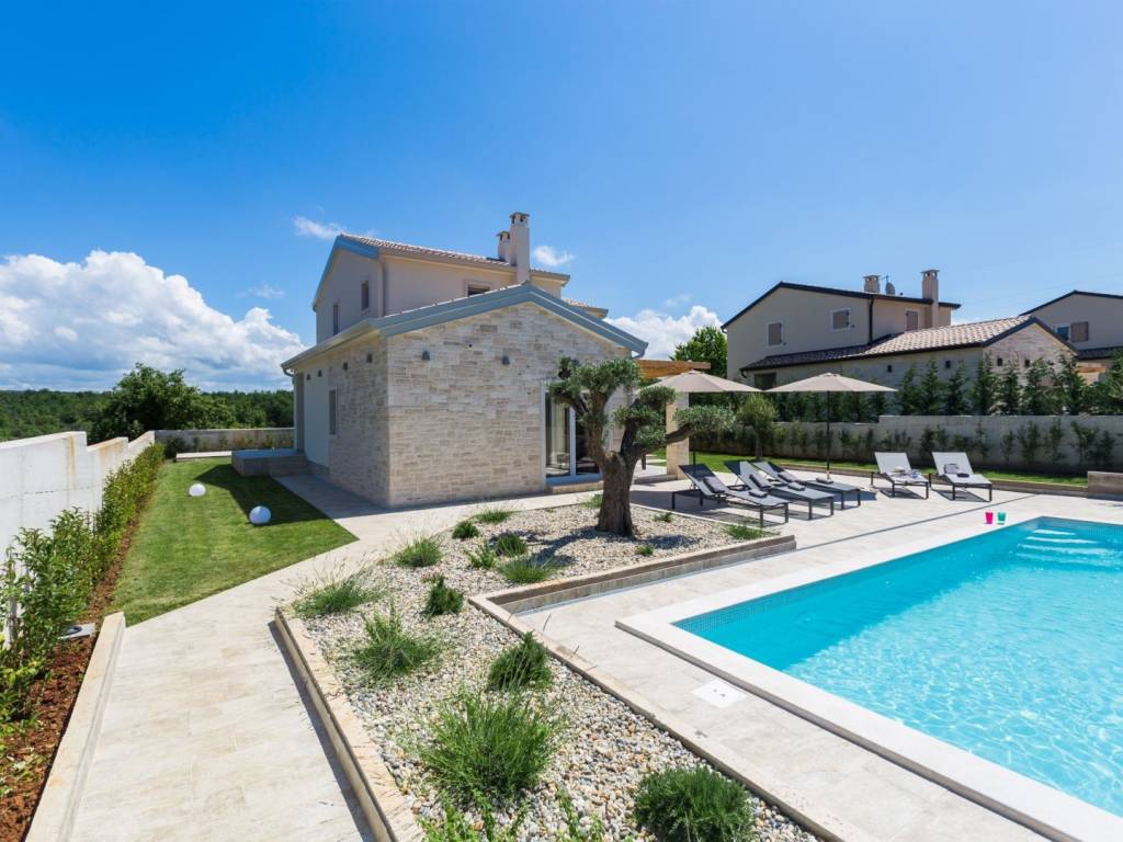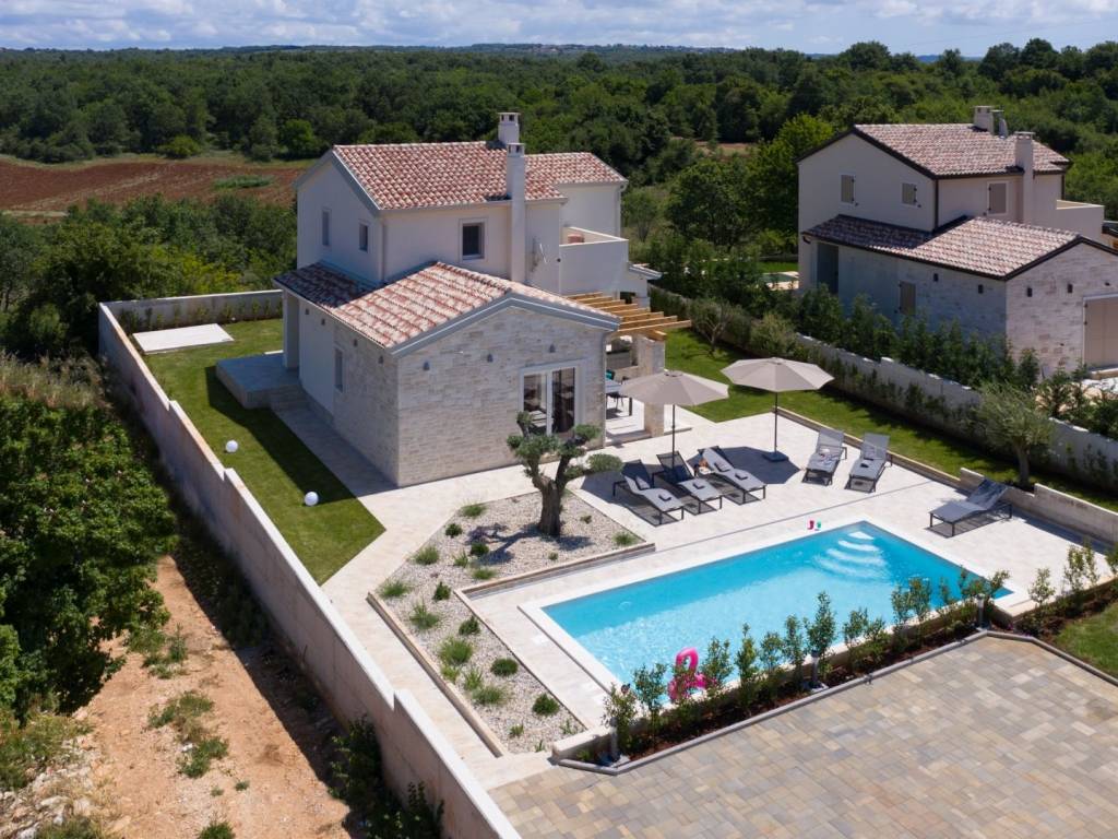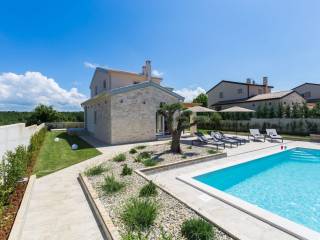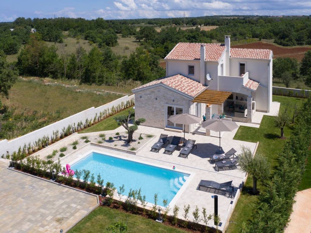 Predstavljamo vam ovu predivnu novu moderno oprelmljenu villu s bazenom koja se nalazi nedaleko Poreča, na mirnoj lokaciji. Villa ima ukupnu stambenu površinu od 140 m2 te ima ukupno tri moderno namještene spavaće sobe s grijanjem/hlađenjem, vlastitim kupaonicama i mrežama protiv komaraca na prozorima. Neposredno na ulazu u prizemlje imamo open space prostor gdje je dnevni boravak s kaminom povezan s moderno opremljenom kuhinjom i blagovaonicom, s izlazom na natkrivenu vanjsku terasu. U ovom dijelu prizemlja diskretno je odvojena spavaća soba s kupaonicom i gostinjskim wc-om. Unutarnje stepenice vode na prvi kat gdje se nalaze dvije spavaće sobe s kupaonicama i balkon s prekrasnim pogledom na okolicu. U središnjem dijelu vrta nalazi se bazen veličine 32 m² sa sunčalištem, okružen njegovanim travnjakom s mediteranskim biljem i maslinama. Dvorište koje je ograđeno sa svih strana pruža apsolutnu privatnost. Nekretnina ima već dobro uhodani posao najma. Više na upit.