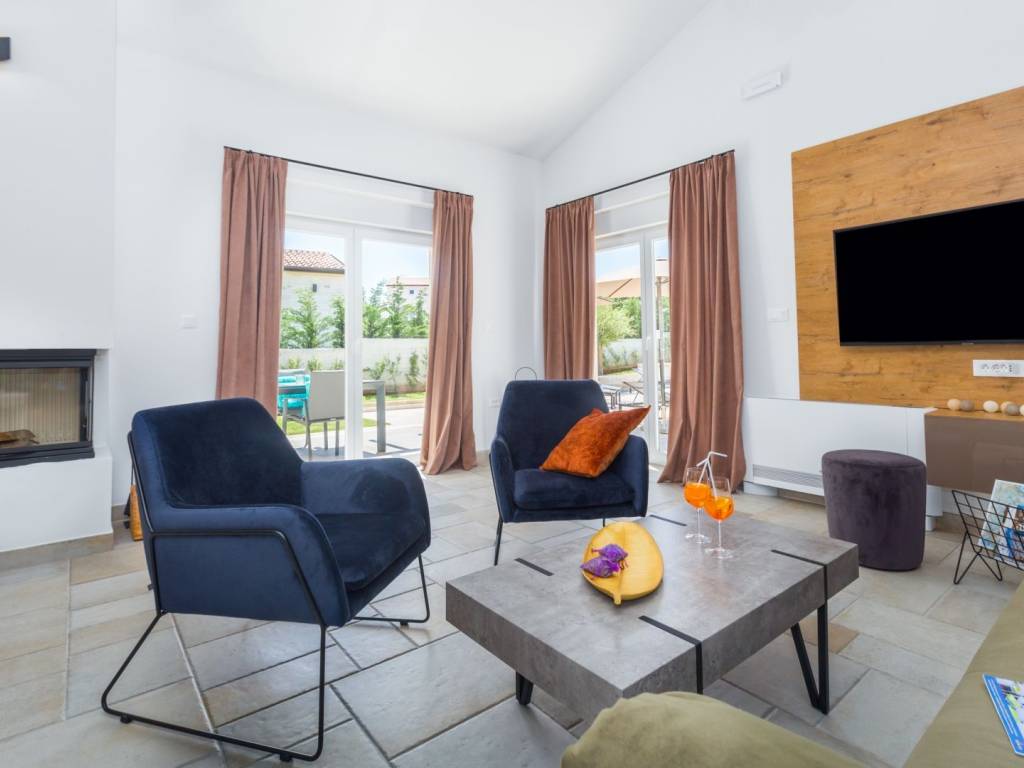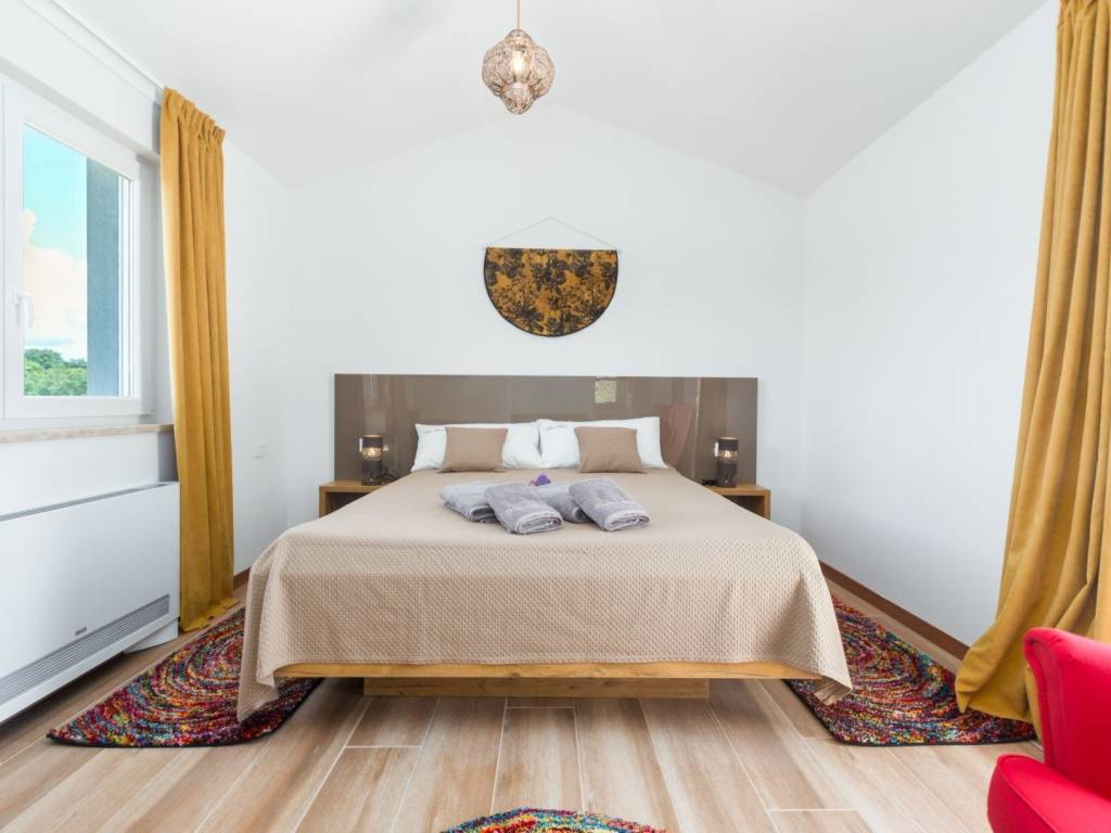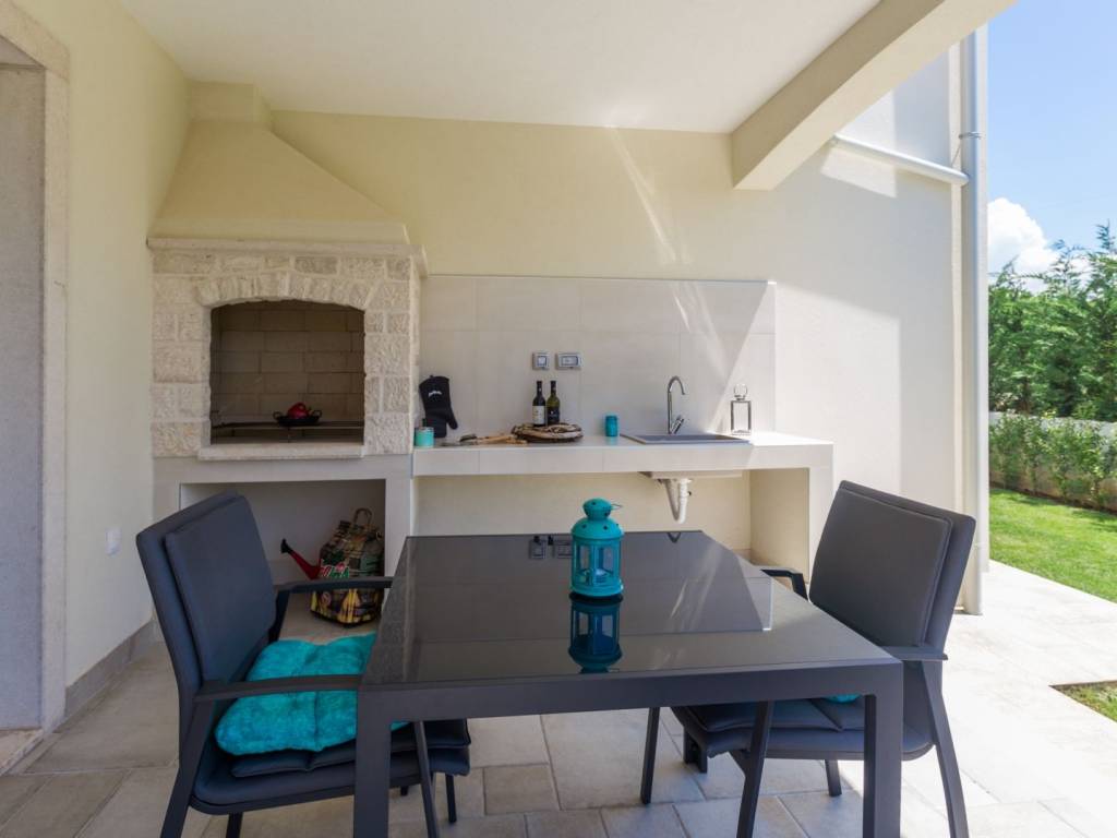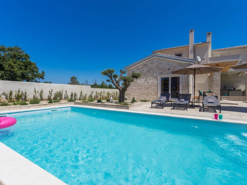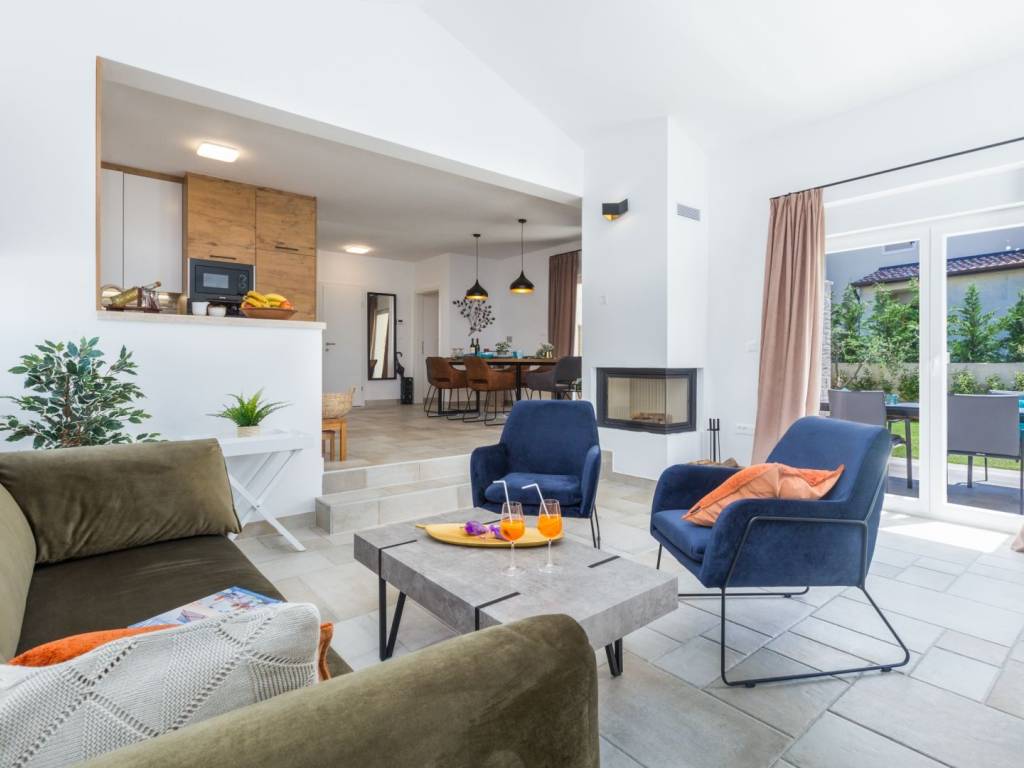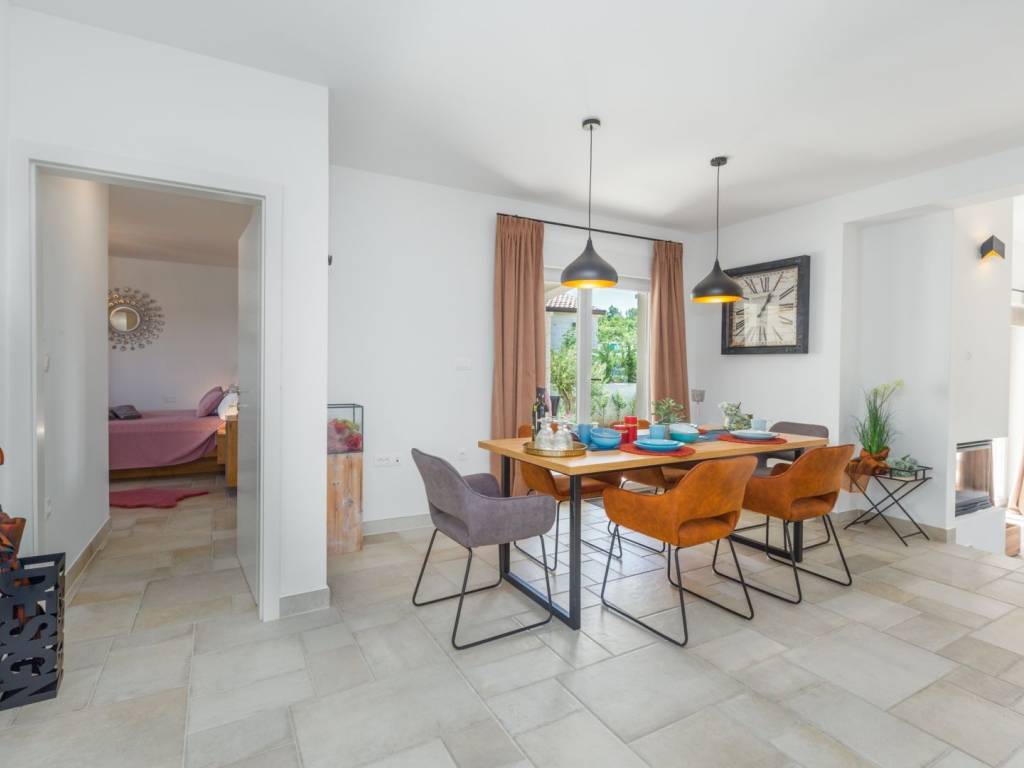 Predstavljamo vam ovu predivnu novu moderno oprelmljenu villu s bazenom koja se nalazi nedaleko Poreča, na mirnoj lokaciji. Villa ima ukupnu stambenu površinu od 140 m2 te ima ukupno tri moderno namještene spavaće sobe s grijanjem/hlađenjem, vlastitim kupaonicama i mrežama protiv komaraca na prozorima. Neposredno na ulazu u prizemlje imamo open space prostor gdje je dnevni boravak s kaminom povezan s moderno opremljenom kuhinjom i blagovaonicom, s izlazom na natkrivenu vanjsku terasu. U ovom dijelu prizemlja diskretno je odvojena spavaća soba s kupaonicom i gostinjskim wc-om. Unutarnje stepenice vode na prvi kat gdje se nalaze dvije spavaće sobe s kupaonicama i balkon s prekrasnim pogledom na okolicu. U središnjem dijelu vrta nalazi se bazen veličine 32 m² sa sunčalištem, okružen njegovanim travnjakom s mediteranskim biljem i maslinama. Dvorište koje je ograđeno sa svih strana pruža apsolutnu privatnost. Nekretnina ima već dobro uhodani posao najma. Više na upit.