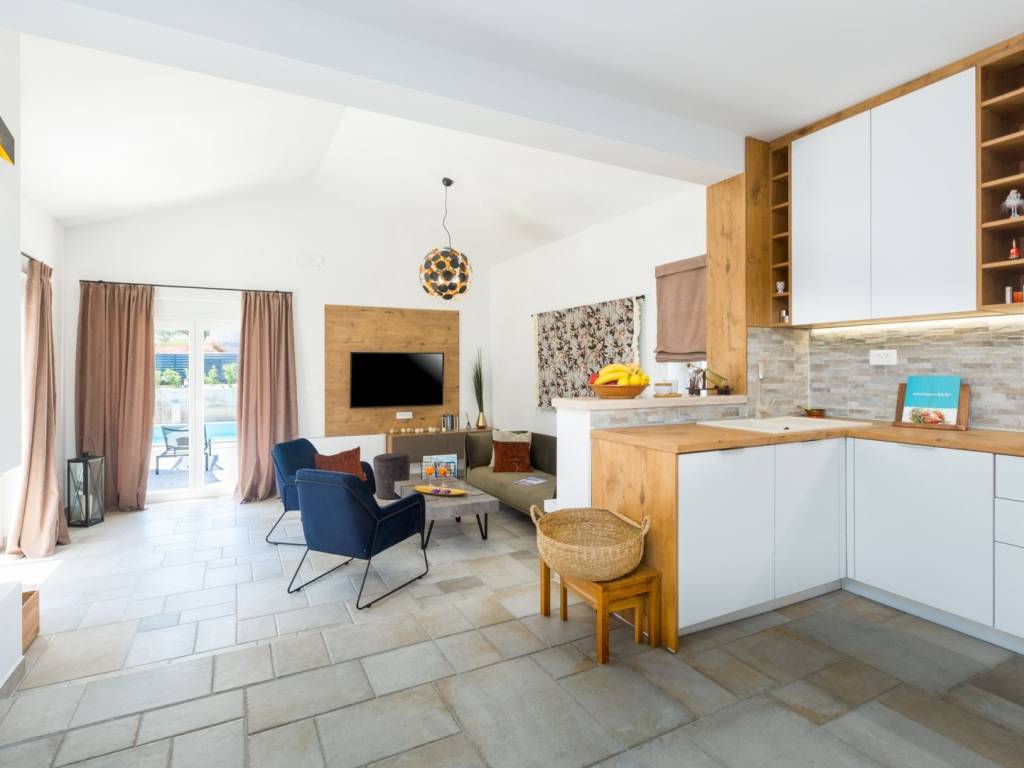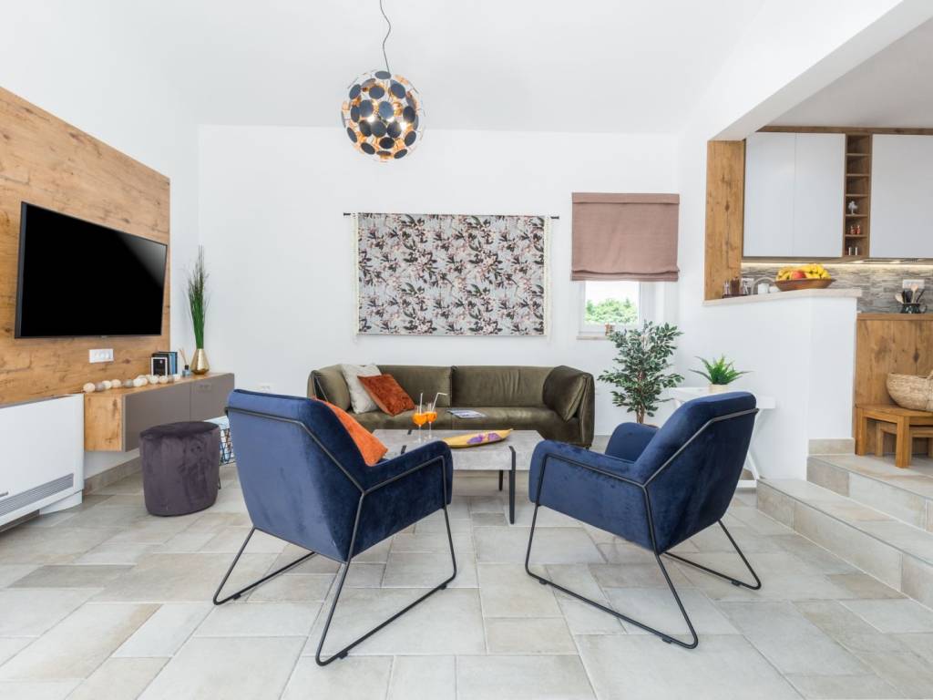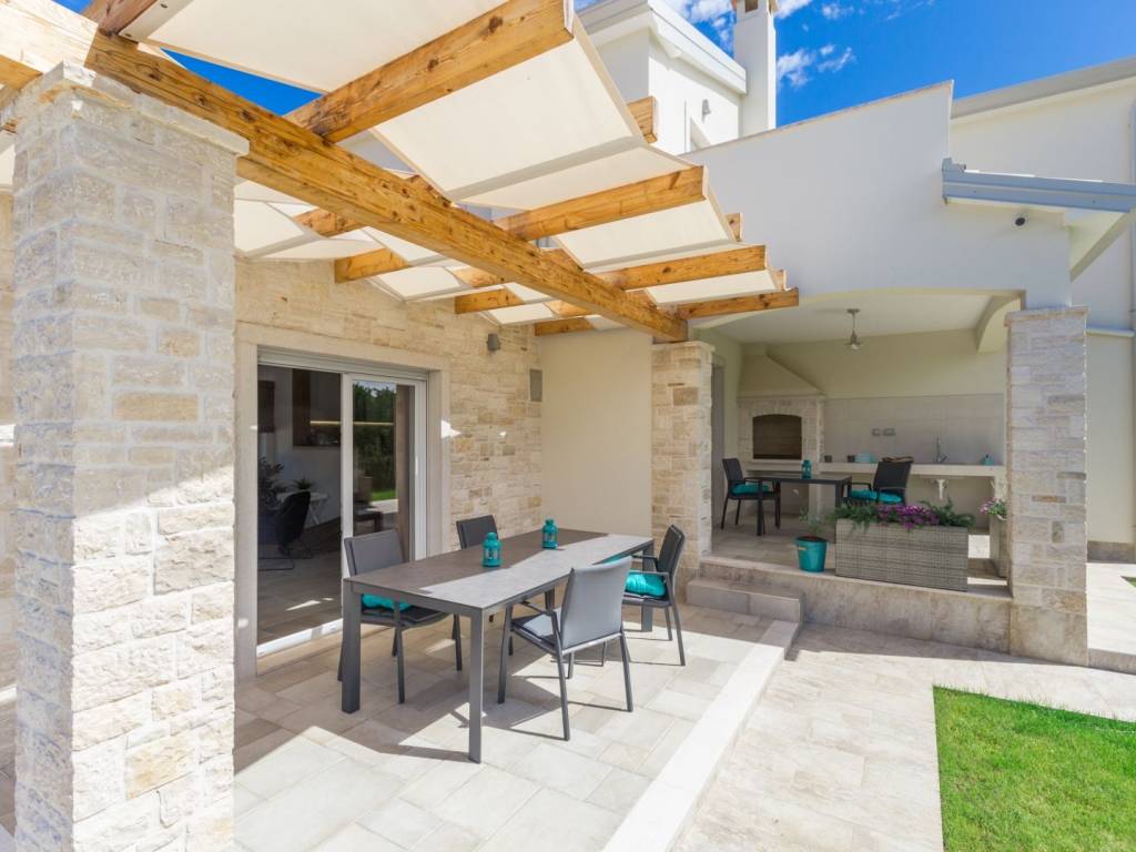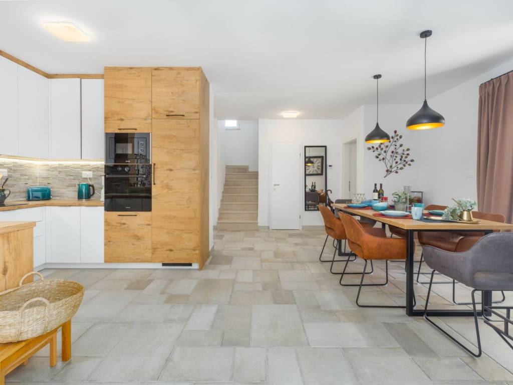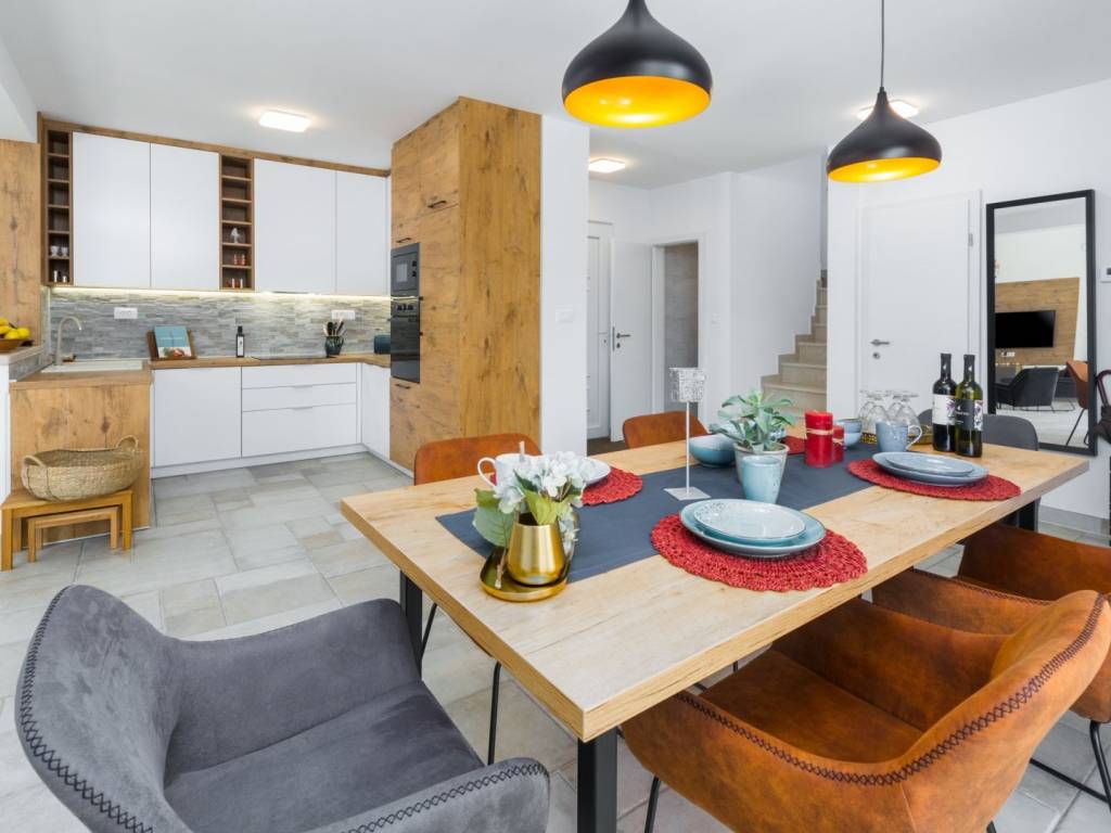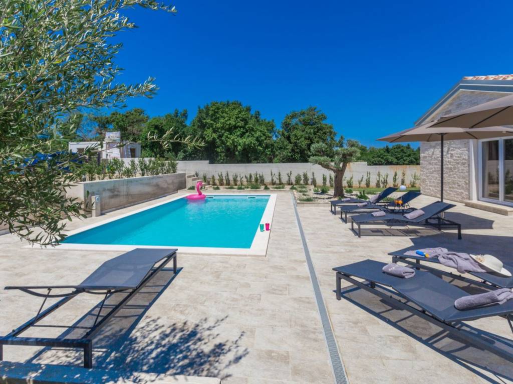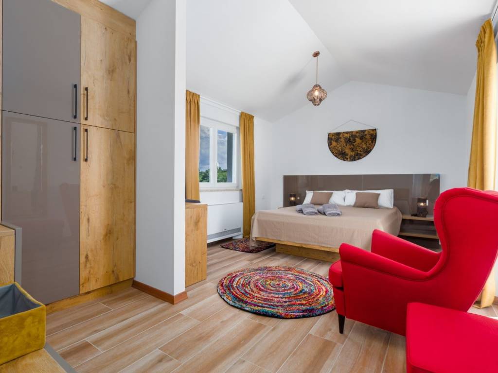 Predstavljamo vam ovu predivnu novu moderno oprelmljenu villu s bazenom koja se nalazi nedaleko Poreča, na mirnoj lokaciji. Villa ima ukupnu stambenu površinu od 140 m2 te ima ukupno tri moderno namještene spavaće sobe s grijanjem/hlađenjem, vlastitim kupaonicama i mrežama protiv komaraca na prozorima. Neposredno na ulazu u prizemlje imamo open space prostor gdje je dnevni boravak s kaminom povezan s moderno opremljenom kuhinjom i blagovaonicom, s izlazom na natkrivenu vanjsku terasu. U ovom dijelu prizemlja diskretno je odvojena spavaća soba s kupaonicom i gostinjskim wc-om. Unutarnje stepenice vode na prvi kat gdje se nalaze dvije spavaće sobe s kupaonicama i balkon s prekrasnim pogledom na okolicu. U središnjem dijelu vrta nalazi se bazen veličine 32 m² sa sunčalištem, okružen njegovanim travnjakom s mediteranskim biljem i maslinama. Dvorište koje je ograđeno sa svih strana pruža apsolutnu privatnost. Nekretnina ima već dobro uhodani posao najma. Više na upit.
