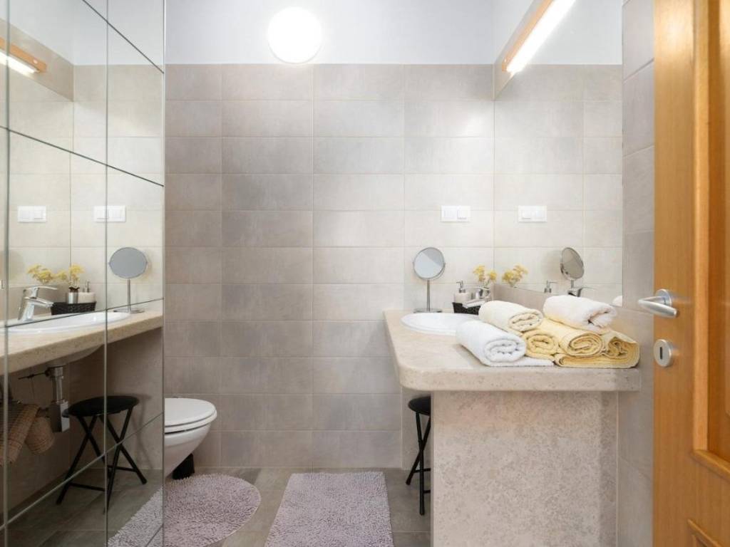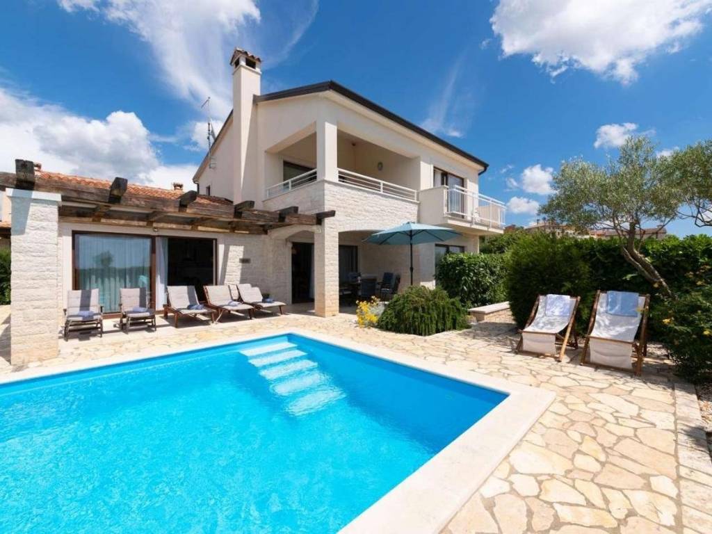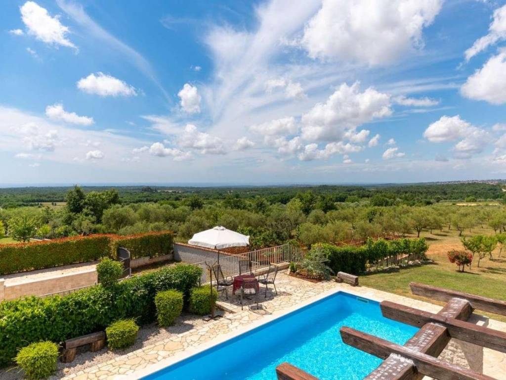 U okolici Višnjana nedaleko mora prodaje se ova lijepa vila s bazenom površine 166 m2. Ovu nekretninu krasi posebno fantastičan pogled na more koji za lijepog i bistrog vremena seže do Venezie, te na okolnu prirodu i maslinike. Kuća je raspoređena na prizemlje i kat. U prizemlju kuće imamo dnevni boravak s blagovaonom i kuhinjom, jednu spavaću sobu s vlastitom kupaonicom i wcom za goste. Na prvom katu imamo još dvije spavaće sobe, svaka sa svojom kupaonom i terasom. Sa terase pruža se prekrasan pogled na more i okolno zelenilo. Na okućnici površine 500m2 imamo bazen sa sunčalištem, s nesmetanim pogledom, obzirom da je vila na rubu mjesta. Kuća se grije i hladi preko klima uređaja, te kaminom u dnevnom boravku. Vila se uspješno turistički iznajmljuje u sezoni. Po dogovoru vlasnik je spreman ustupiti još ekstra 200 m2 od susjedne parcele na kojoj je maslinik tako da bi se dobila još veća okućnica.