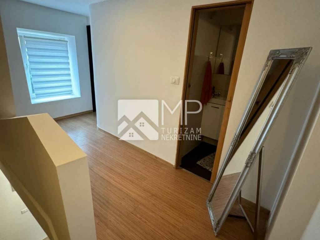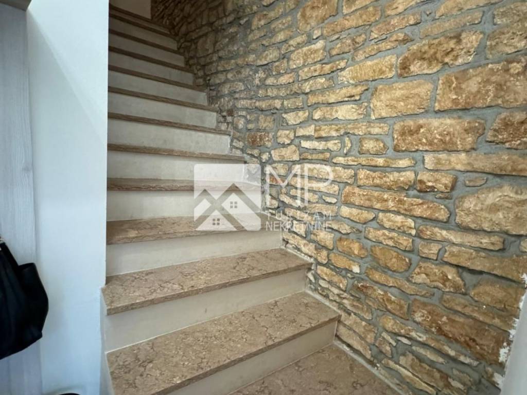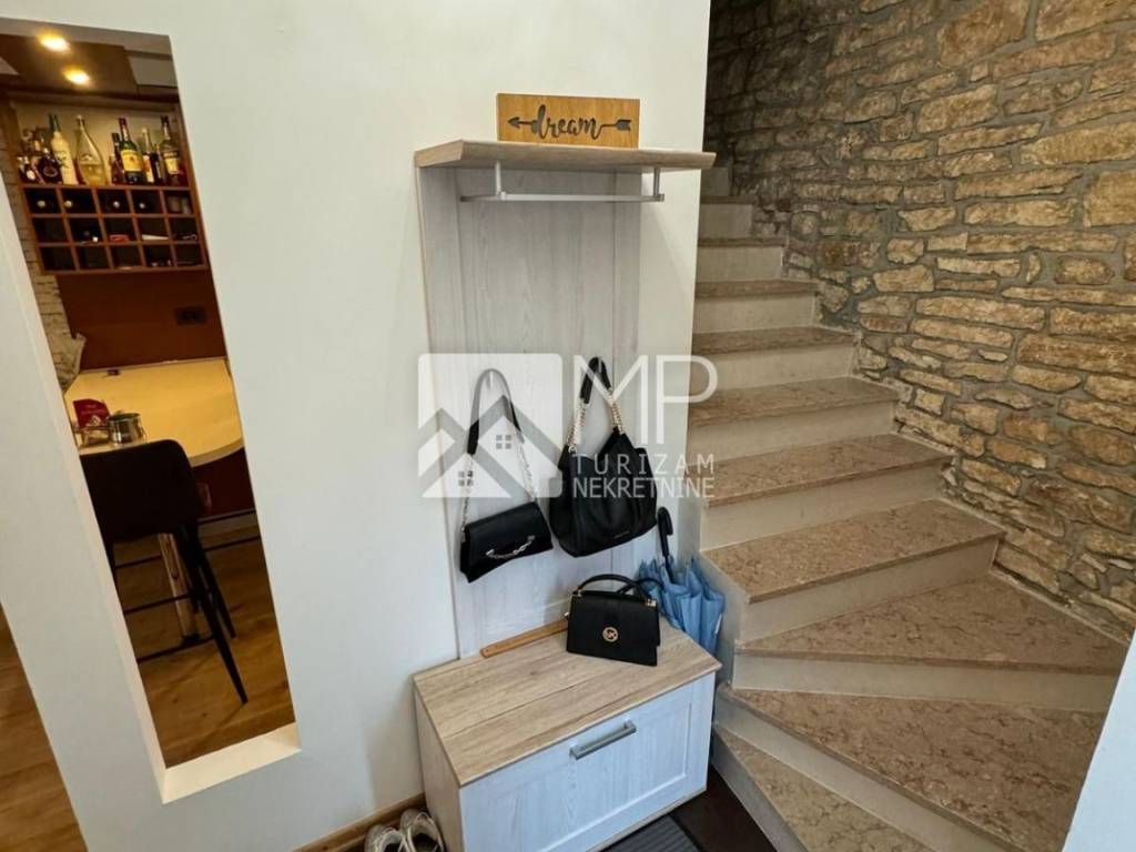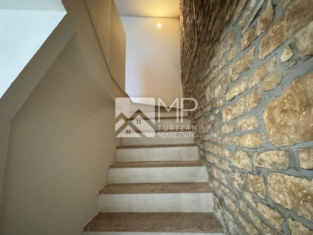 Na donjoj etaži dočekuje nas ulazni hodnik, dnevni boravak s kuhinjom te unutarnje stepenice koje ukrašava kameni zid i koje nas vode na prvu etažu gdje se smjestila spavaća soba sa vlastitom kupaonicom, te dodatni wc. Na drugoj etaži je smještena dječja i radna soba, a budući kupac, ima mogućnost po vlastitom izboru napraviti prenamjenu i napraviti još jednu kupaonu. Na trećoj etaži što zapravo ovoj kući daje veliku prednost, je prekrasna terasa sa panoramskim pogledom, gdje je sadašnji vlasnik odlično osmislio i napravio sve pripreme za "mini kuhinju" i wc, kako bi maksimalno uživali u potpunoj idili oaze i mira.