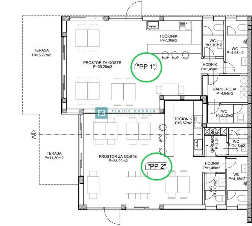 Poslovni prostor PP1 sastoji se od otvorenog prostora, garderobe, WC-a za osoblje, hodnika, WC-a za žene, WC-a za muškarce. Prostori su prepuni dnevnog svjetla i lijepi pogled na more i arhipelag.