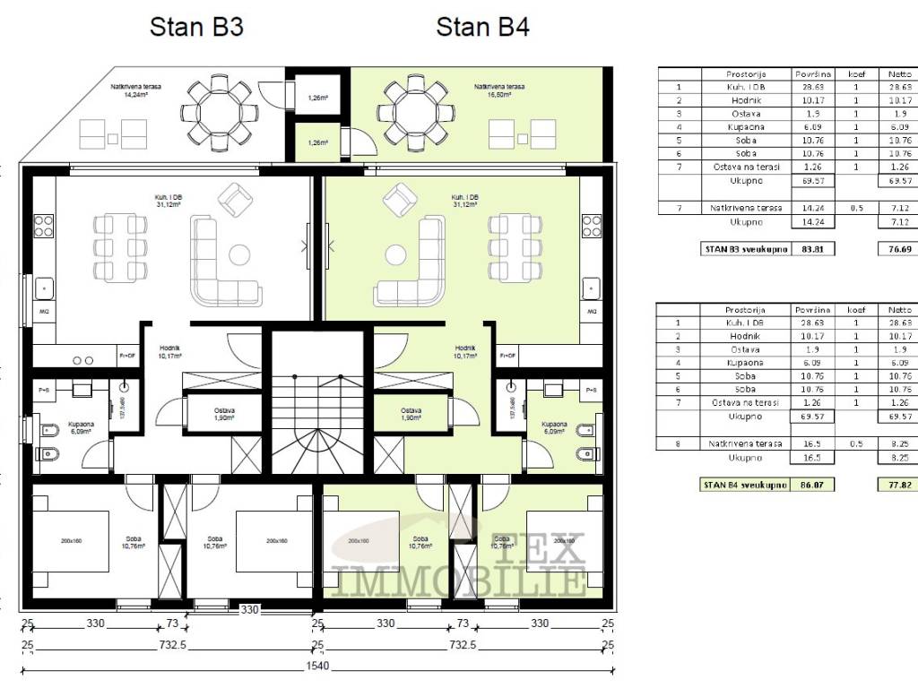 Stanovi su raspoređeni na dvije etaže, u prizemlju i na katu. Osim visokokvalitetne gradnje, zgrada će biti opremljena vrhunskom opremom, uključujući termoizolaciju zgrade debljine 10 cm, krovnu izolaciju debljine 20 cm, kvalitetnu alu i pvc stolariju te postavljeni klima uređaji u svakom stanu.