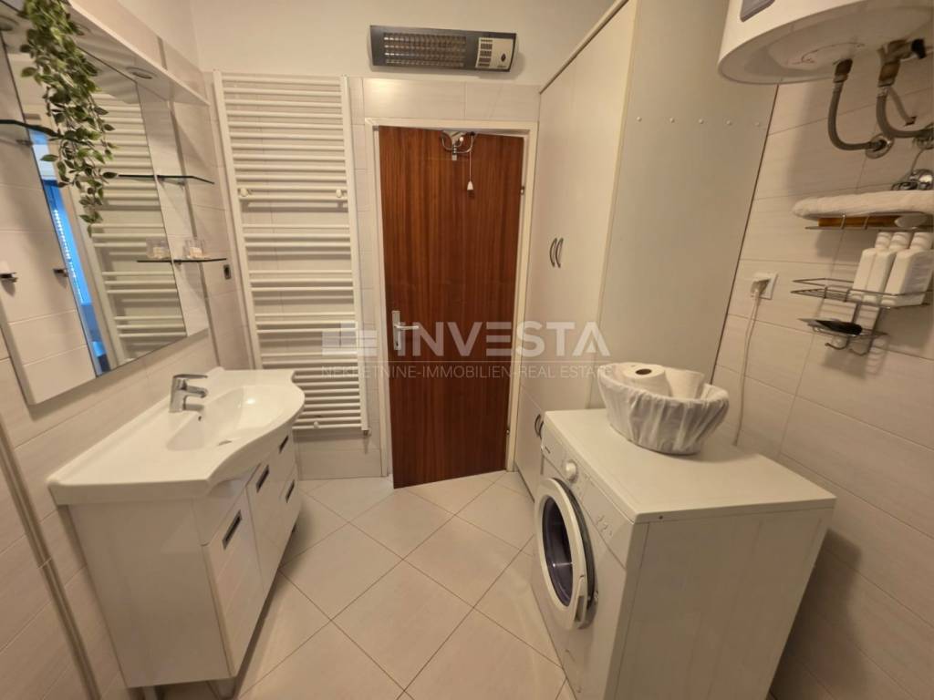 Stan je održavan i prodaje se potpuno namješten. Opremljen je PVC prozorima s drvenim griljama, podovi su obloženi pločicama i laminatom, a grijanje je centralno na lož ulje. U stanu je i klima uređaj. Kotlovnica s pumpom nalazi se u prizemlju, a pristup joj je moguć i iz hodnika zgrade i s parkinga.