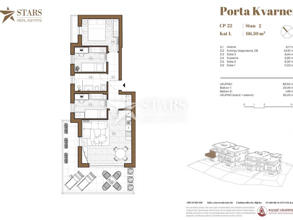 Stan + balkon ukupno: 92,43 m²