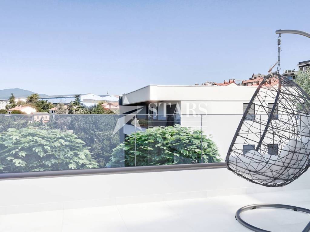Prostrani balkon pruža panoramski pogled na more i kvarnerske otoke, što dodatno naglašava vrijednost ove nekretnine.