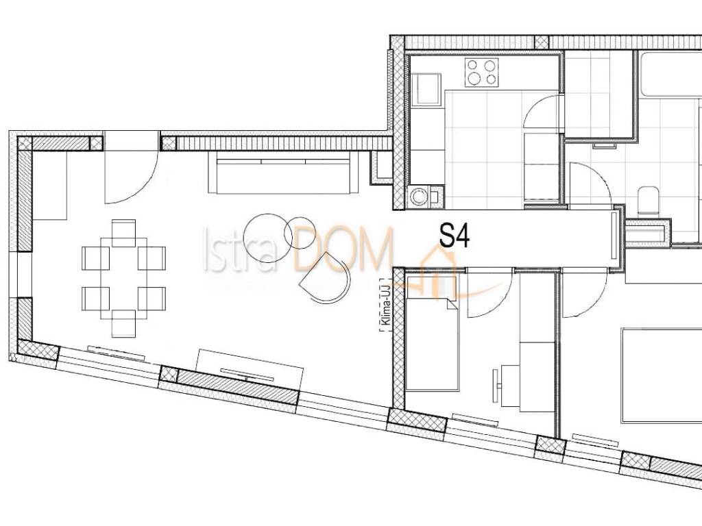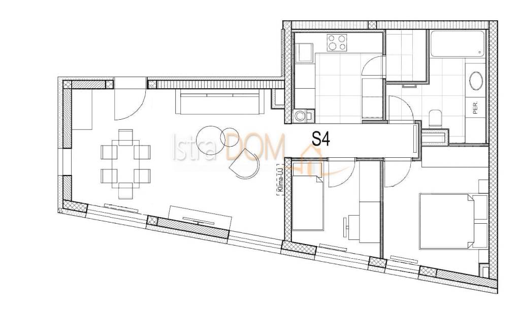 Stan se sastoji od dnevnog boravka s kuhinjom i blagovaonicom, dvije spavaće sobe, kupaonice s WC-om, izbe te hodnika.
