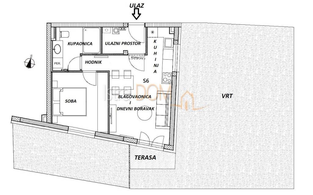 Stan se sastoji od dnevnog boravka s kuhinjom i blagovaonicom, spavaće sobe, kupaonice s WC-om, ulaznog prostora, terase te vrta (100.50 m2).