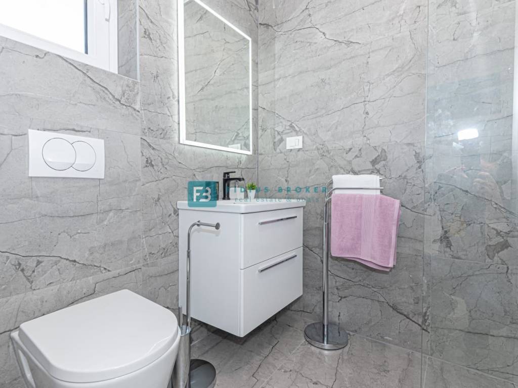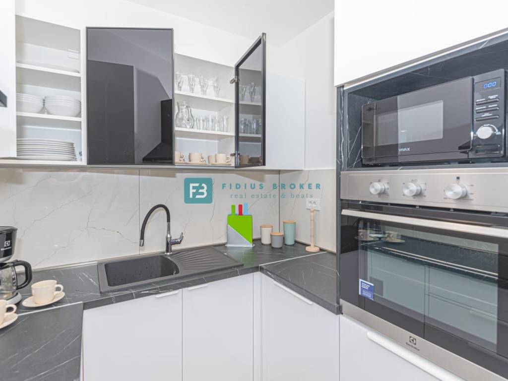 Nekretnina je građena vrhunskim materijalima i opremljena luksuznim uređajima kako bi pružila vrhunski životni standard. Od opreme izdvajamo: stiropor fasada, protuprovalna vrata, svaka stambena jedinica ima grijani vanjski bazen, ljetnu kuhinju s roštiljem, parking za dva automobila, uređena i ograđena okućnica, kupaonice imaju električno podno grijanje, sve prostorije su klimatizirane, a u dnevnom boravku postoji mogućnost grijanja na kruta goriva s obzirom da je na tom mjestu ugrađen dimnjak. Sa 1. kata pruža se djelomičan pogled na more, a postoji opcija ugradnje montažnih stepenica koje bi omogućile pristup krovu. Krov se može urediti kao prohodna terasa s koje bi se pružao prekrasan panoramski pogled na more i okolinu.