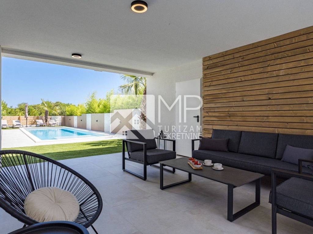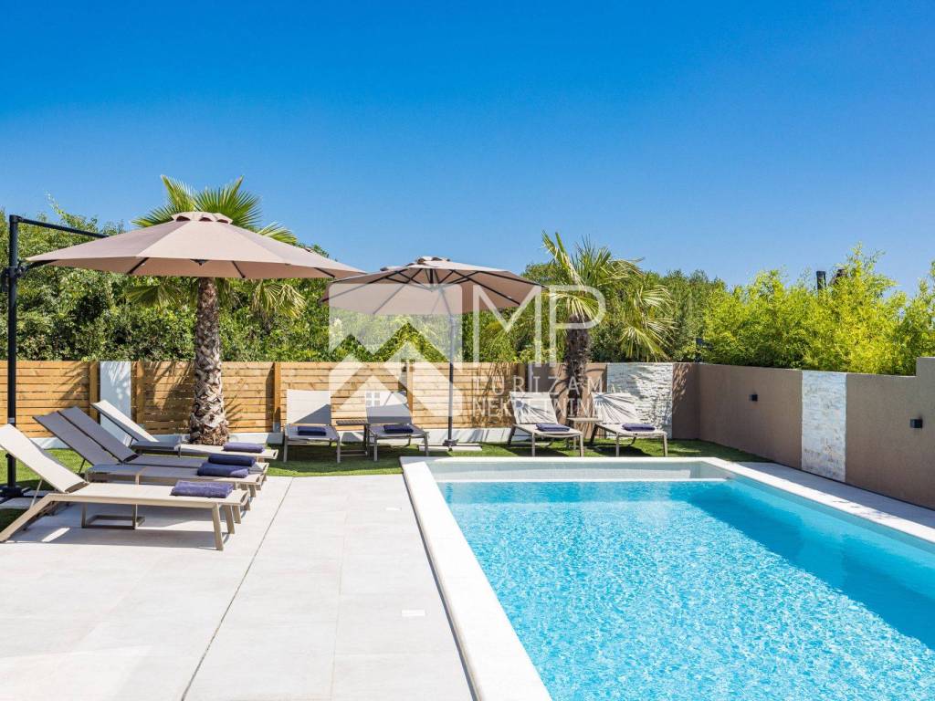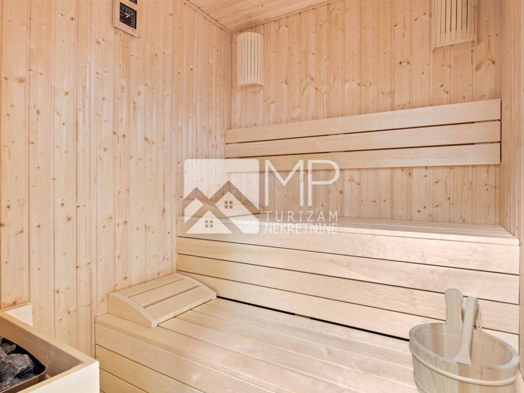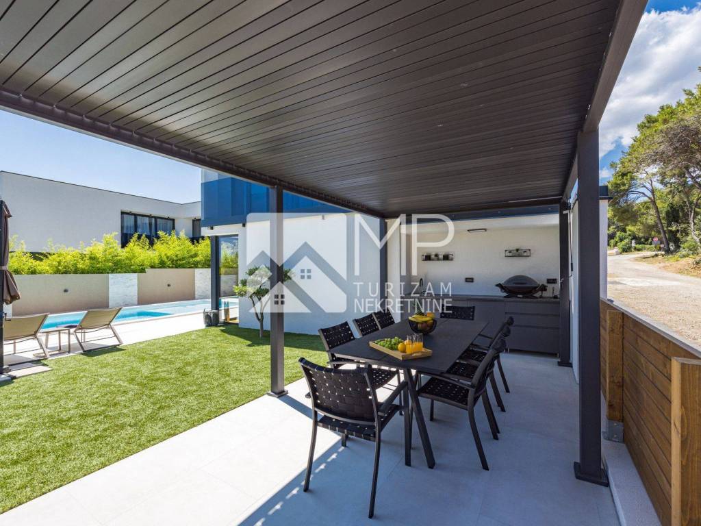 Privatni bazen od 40 m² sa slanom vodom i mogućnošću grijanja postaje srce vanjskog prostora, okružen ležaljkama i sunčanim terasama. Natkrivena terasa s vanjskom kuhinjom i blagovaonicom za 8 osoba savršena je za nezaboravne večeri uz roštilj i čašu vina, dok vrt nudi privatnost i mir bez premca.
