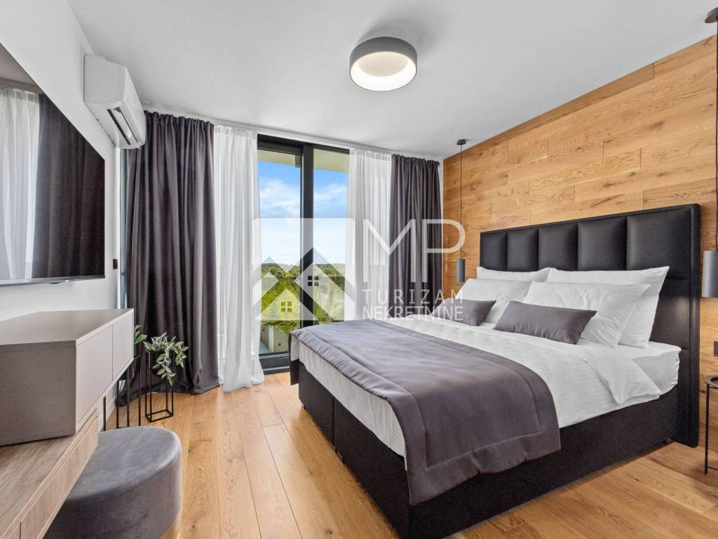 Smještena na parceli od 500 m², vila pruža 220 m² stambenog prostora osmišljenog za maksimalnu udobnost i privatnost. Četiri spavaće sobe s bračnim krevetima (dimenzije 160x200) i vlastitim kupaonicama osiguravaju savršeni mir za sve goste, dok dodatna peta kupaonica omogućuje fleksibilnost i praktičnost tijekom boravka. Svaka prostorija uređena je u modernom stilu, s klimom, sefom i TV-om, a za obitelji dostupna je i dječja kolijevka.