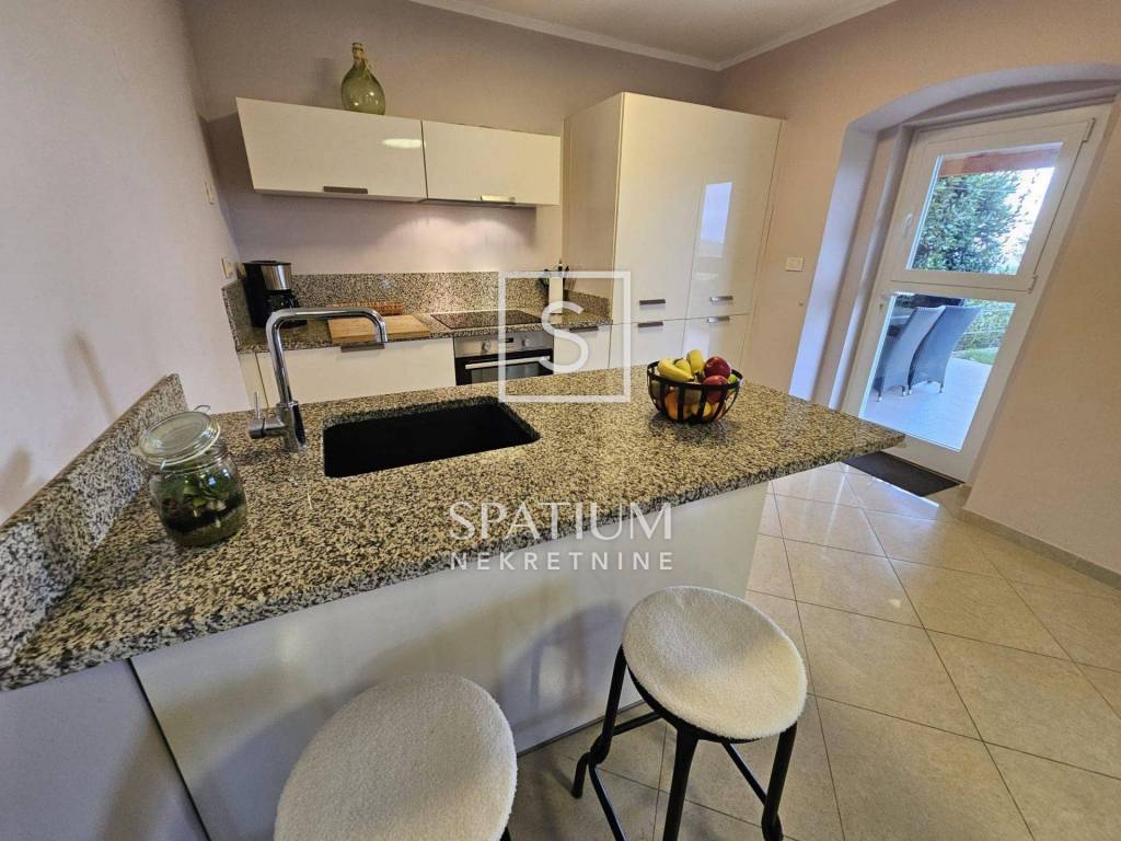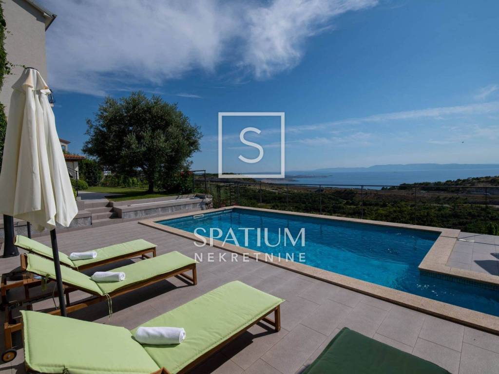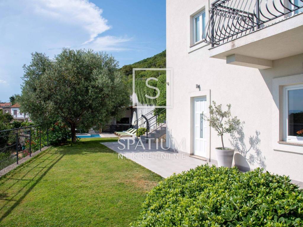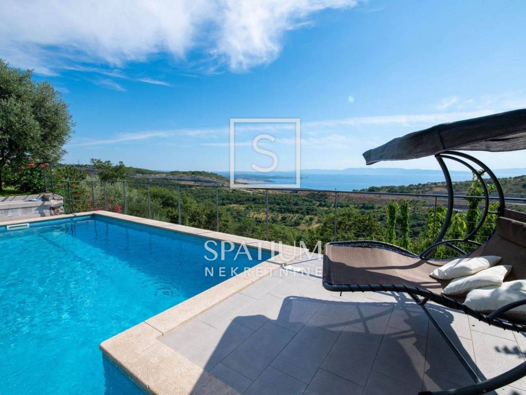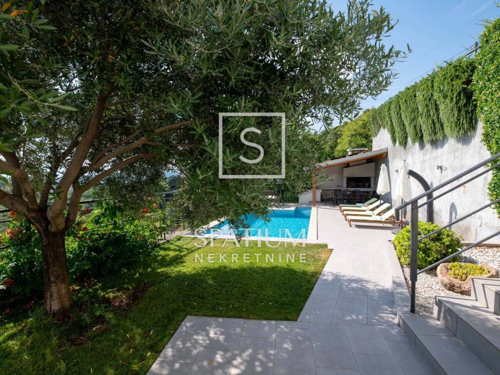 Na prvoj etaži koja je u naravi prizemlje kuće imamo prostrani dnevni boravak sa blagavaonicom i kuhinjom, ulazi hodnik, wc i kupaonicu. Na uređenoj okućnici dvije su natkrivene terase, jedna sa roštiljem i vanjskom kuhinjom, savršeno mjesto za druženja i zabavu. Uređeno sunčalište i bazen iz kojeg se pruža savršeni pogled na more. Na drugoj etaži su tri spavaće sobe, kupaonica i hodnik. Izlaz na balkon pružiti će Vam pogled na cijeli Kvarner.