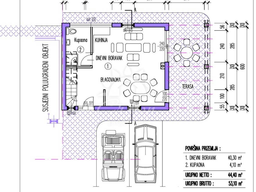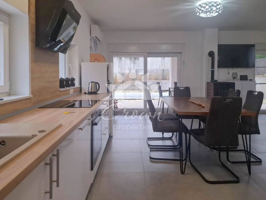 Prizemlje se sastoji od prostranog dnevnog boravka s kuhinjom i blagovaonicom, kupaonice te ostave. Iz dnevnog boravka izlazi se na natkrivenu terasu i bazen površine 24 m², što pruža idealan prostor za opuštanje i druženje.