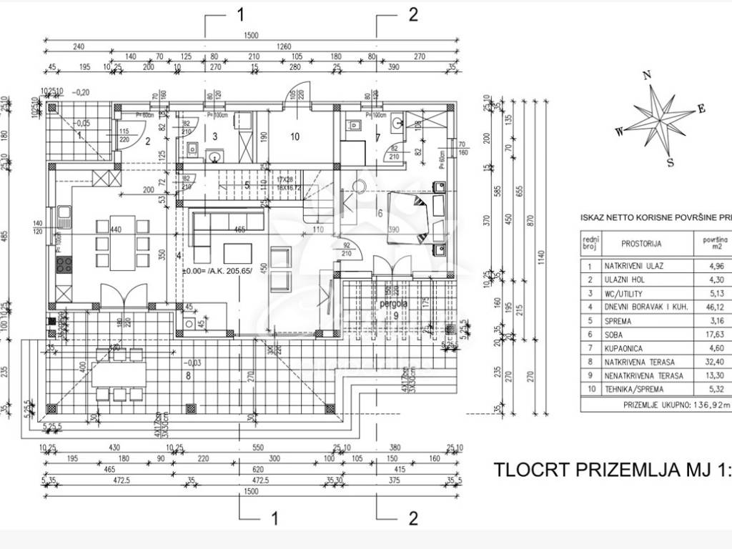 U prizemlju se nalazi otvoreni dnevni prostor koji objedinjuje kuhinju, blagovaonicu i dnevni boravak, s izravnim izlazom na prostranu natkrivenu terasu i vanjski prostor s bazenom, stvarajući idealno mjesto za opuštanje i druženje tijekom cijele godine. Na istoj etaži smještena je i spavaća soba s pripadajućom kupaonicom, dodatni sanitarni čvor, spremišni prostori te tehnička prostorija, što ovu kuću čini izuzetno praktičnom i pogodnom za svakodnevni život.