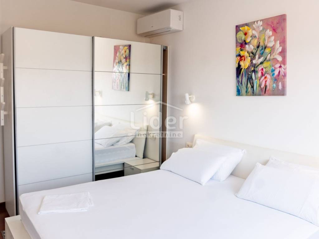 Prodaje se apartman u Barbatu na Rabu. Zgrada se sastoji od 4 apartmana. Nalazi se na drugom katu. Sastoji se od dvije spavaće sobe sa svojim kupaonama te velikog dnevnog boravka, kuhinje i blagovaone tipa open space. Tu se nalaze i dva balkona iz kojih se pruža prekrasan pogled na more i okolne otoke. Stan se prodaje kompletno namješten kvalitetnim talijanskim namještajem. Pripada mu i mali vrt na okućnici te parkirno mjesto. Stan je smješten 200 metara od plaže i 5 km od grada Raba.
