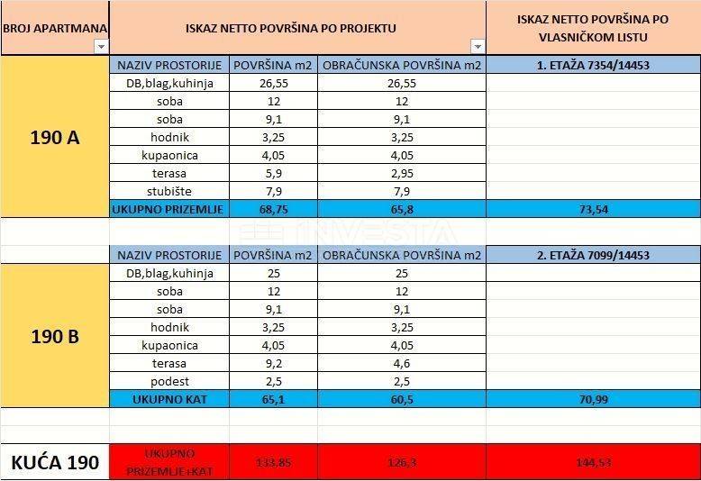 Stan u prizemlju ukupne je netto površine 73,54 m2 dok stan na katu ima 70,99 m2.