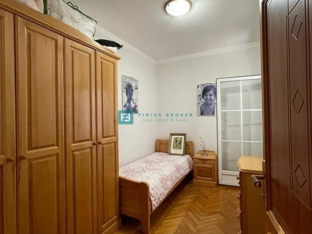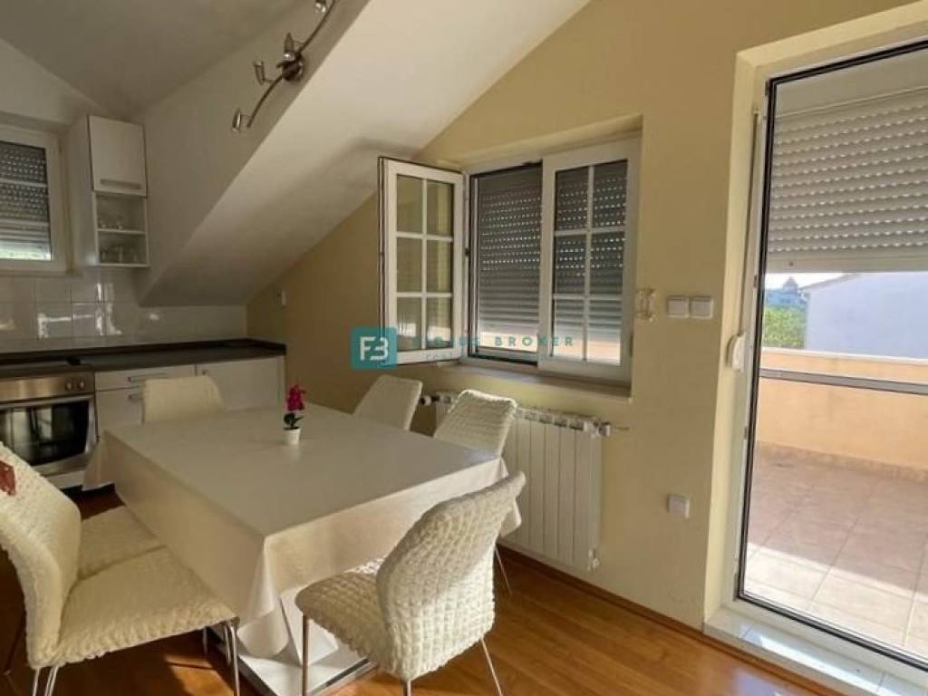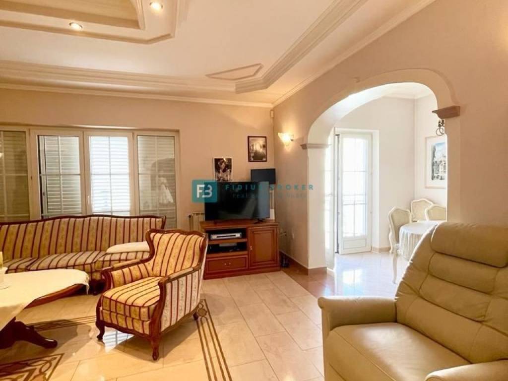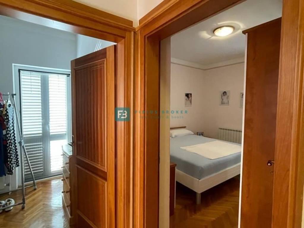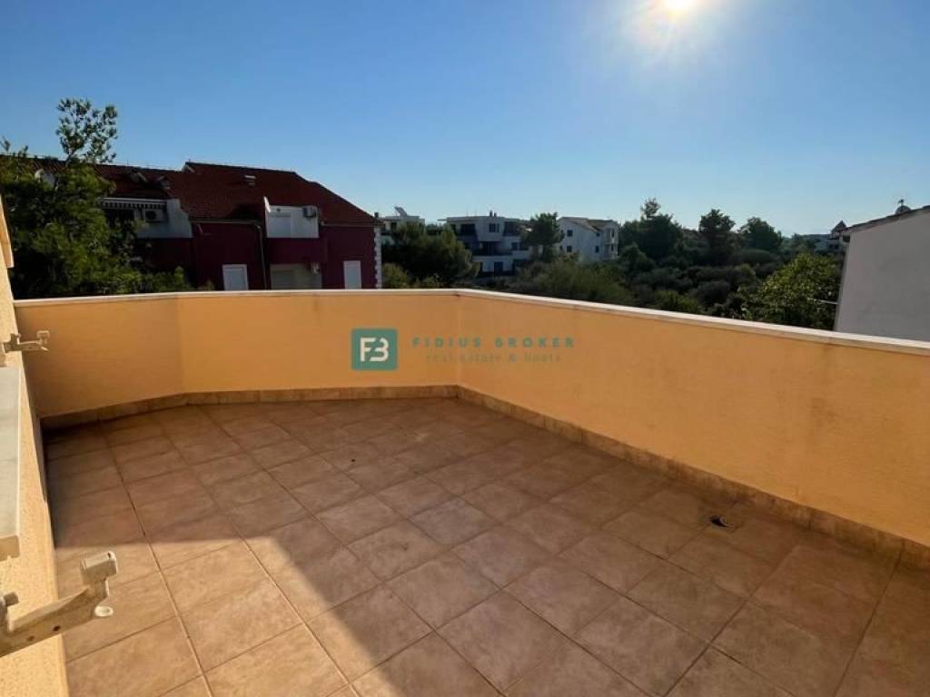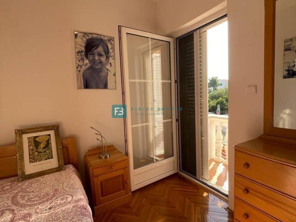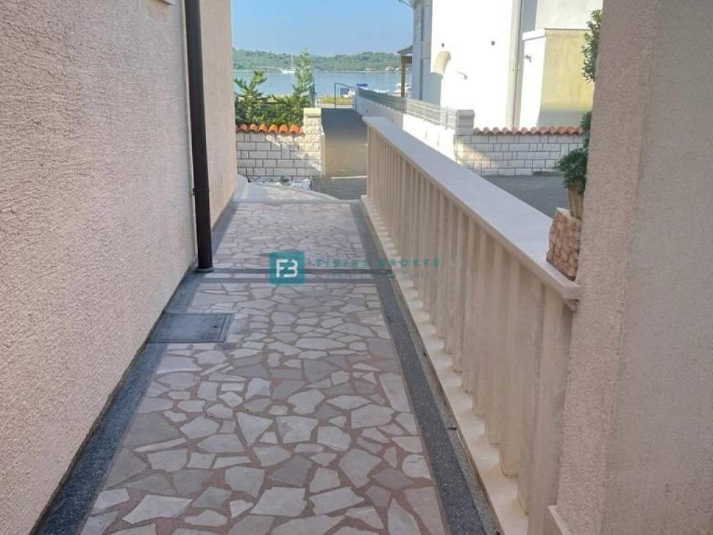 U prizemlju se nalaze tri opremljena studio apartmana, svaki ima ukupnu površinu od 30 m2. Unutarnje stubište vodi na kat ukupne površine 90 m2 gdje se nalazi prostrani apartman koji ima 3 spavaće sobe, kuhinju, ostavu, blagovaonicu, dnevni boravak, veliku kupaonicu s kadom i tušem, WC. U dnevnom boravku se nalazi prekrasan kamin koji dijelom obložen mramorom te šank. Na katu se nalaze tri balkona - jedan veličine 15 m2 te dva manja, svaki od njih ima pogled na more. U visokom potkrovlju nalazi se prostran jednosoban stan ukupne površine 68 m2 koji se sastoji od kuhinje, velikog dnevnog boravka, spavaće sobe i kupaonice, WC-a. U potkrovlju se nalaze dvije velike terase (10 m2 i 12 m2) s pogledom na more.