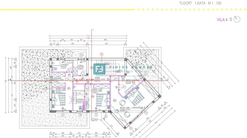 KAT - bruto/neto površina = 97,30 m2 / 97,30 m2 sastoji se od stubišta, hodnika, praonice, tri spavaće sobe s vlastitim kupaonicama i master spavaće sobe s garderobom i master kupaonicom.