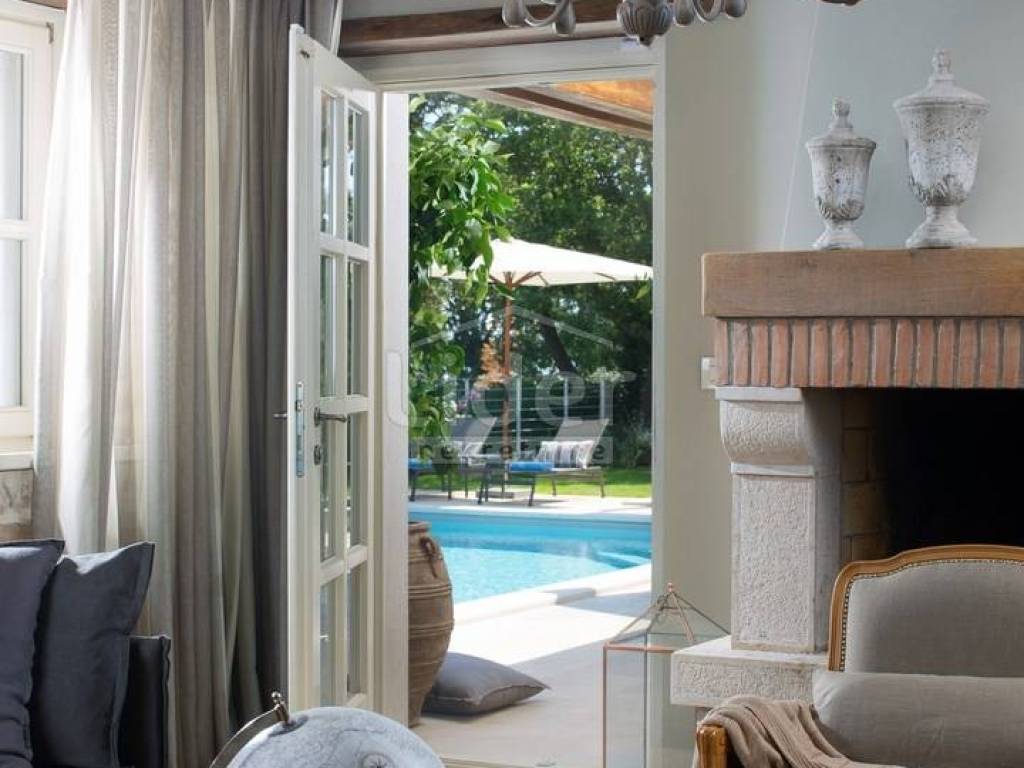 U prizemlju vile nalazi se kuhinja, blagovaona, sanitarni čvor, dnevni boravak sa vanjskim i unutarnjim kaminom,