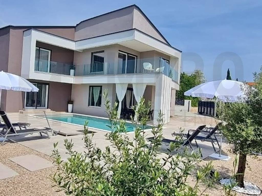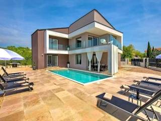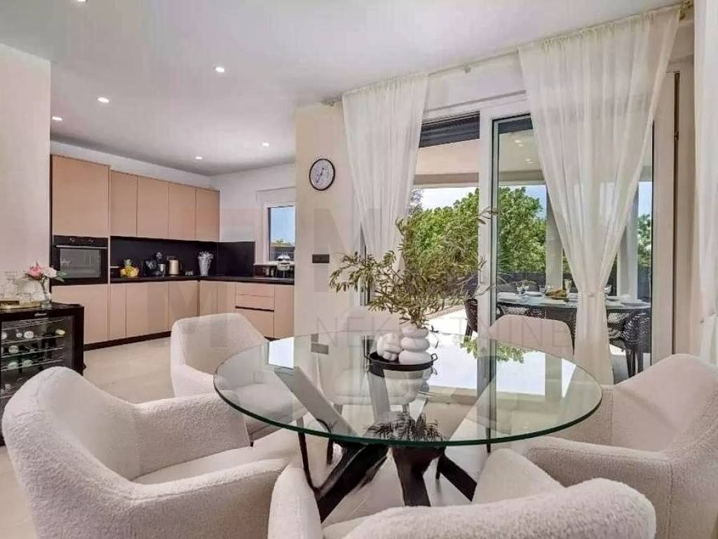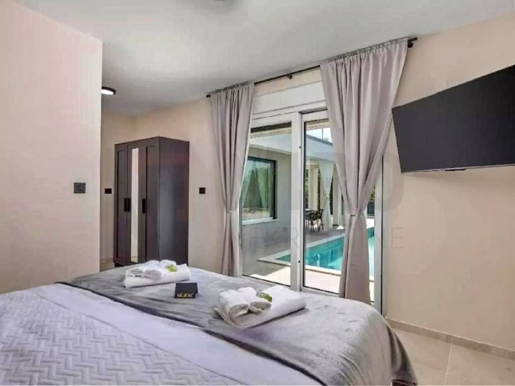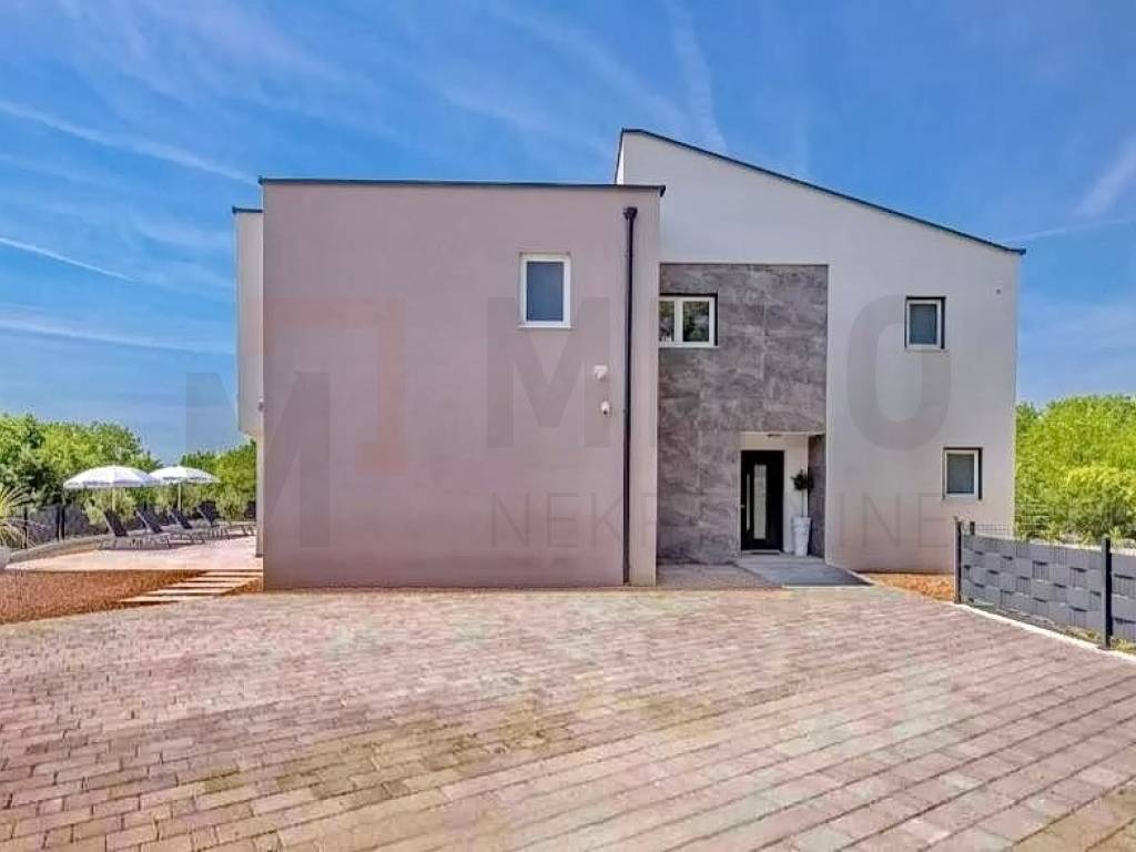 Otok Krk, Vrbnik okolica, nova modrna kuća sa bazenom. Kuća modernog projekta, kategorizirana sa pet zvjezdica, stambene površine 175 m2 . Sastoji se od prizemlja gdje se nalazi dnevni boravak, kuhinja s blagovaonicom, prostrana natkrivena terasa sa izlazom na okućnicu, jedna spavaća soba sa kupaonicom, hodnik, toalet, ostava, unutarnje stepenište za kat gdje su tri spavaće sobe, tri kupaonice, prostrana natkrivena terasa. Kvalitetna gradnja, kompletno namještena. Klimatizirane su sve prostorije,