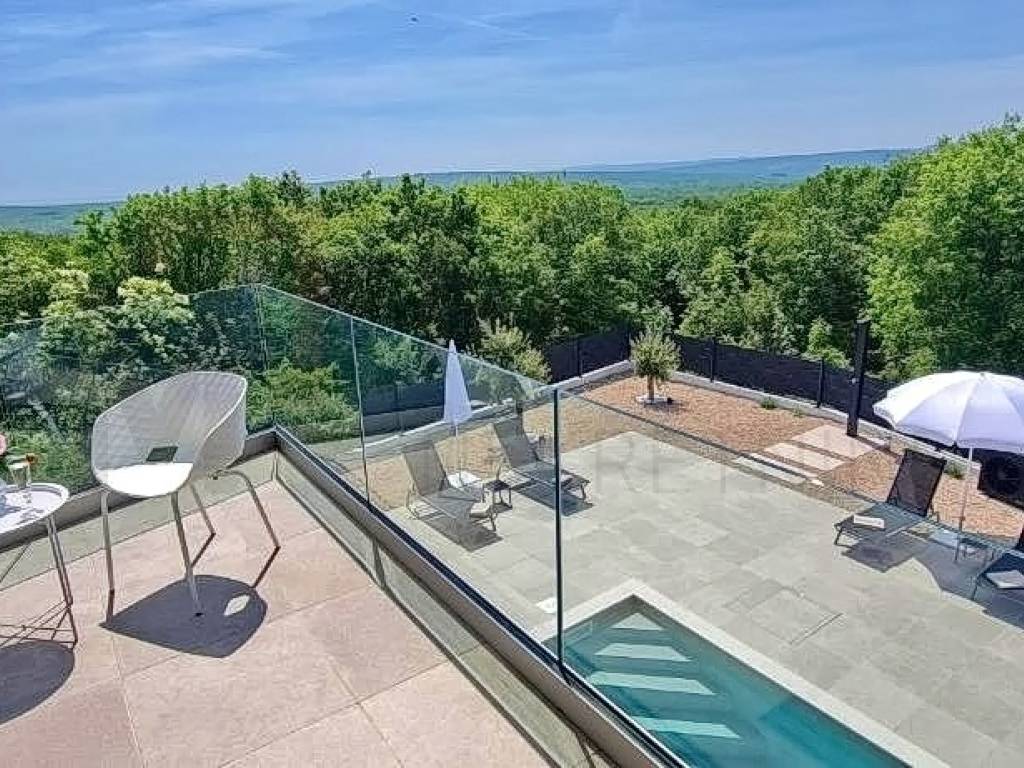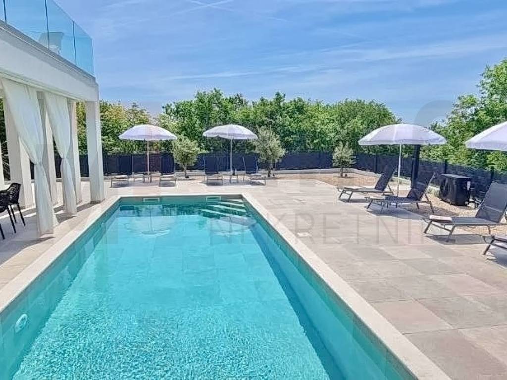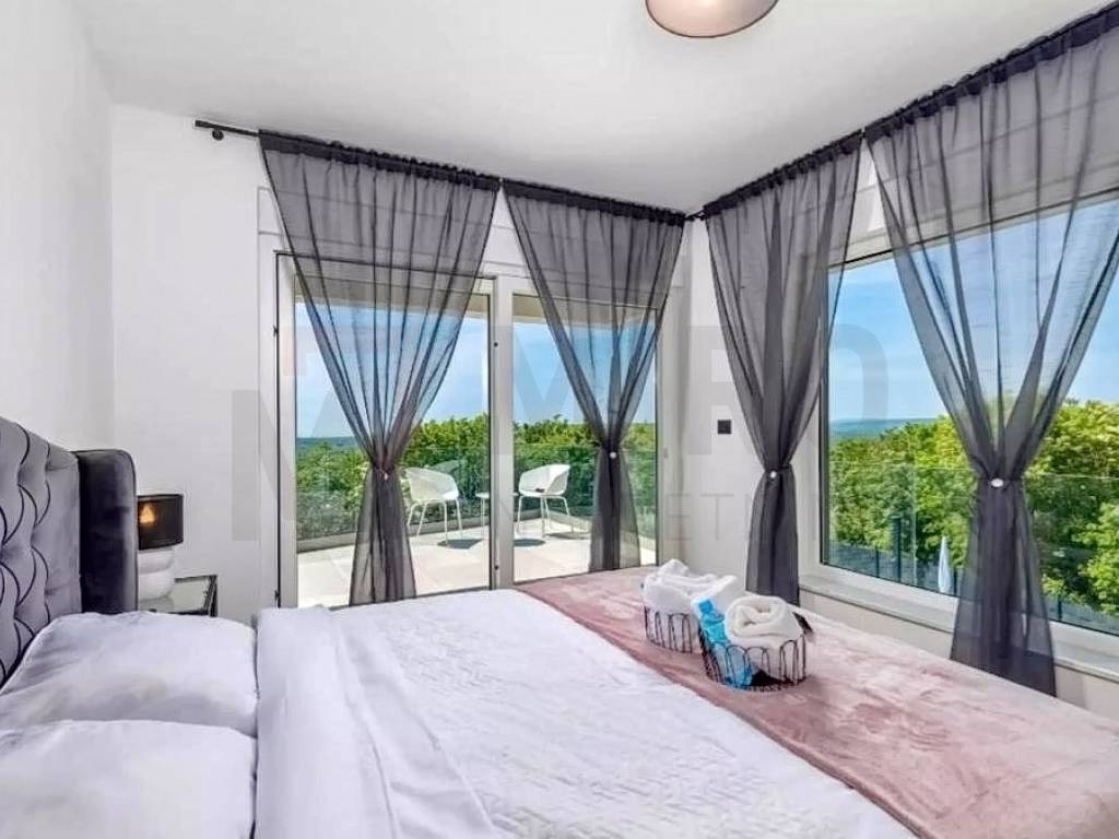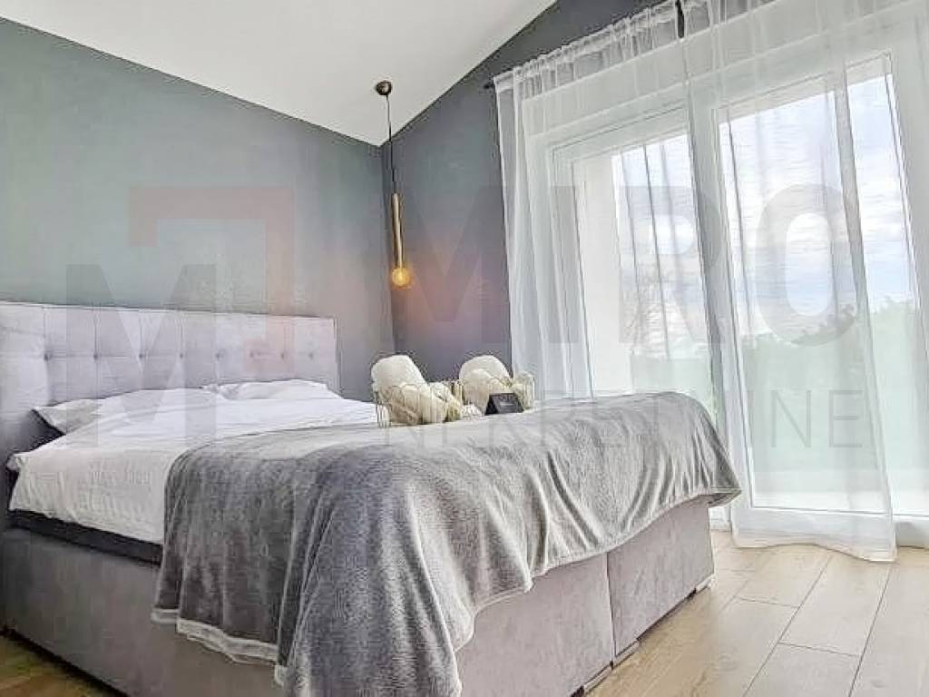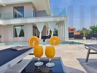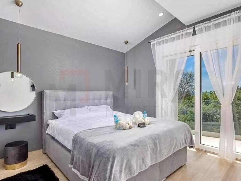 Otok Krk, Vrbnik okolica, nova modrna kuća sa bazenom. Kuća modernog projekta, kategorizirana sa pet zvjezdica, stambene površine 175 m2 . Sastoji se od prizemlja gdje se nalazi dnevni boravak, kuhinja s blagovaonicom, prostrana natkrivena terasa sa izlazom na okućnicu, jedna spavaća soba sa kupaonicom, hodnik, toalet, ostava, unutarnje stepenište za kat gdje su tri spavaće sobe, tri kupaonice, prostrana natkrivena terasa. Kvalitetna gradnja, kompletno namještena. Klimatizirane su sve prostorije,