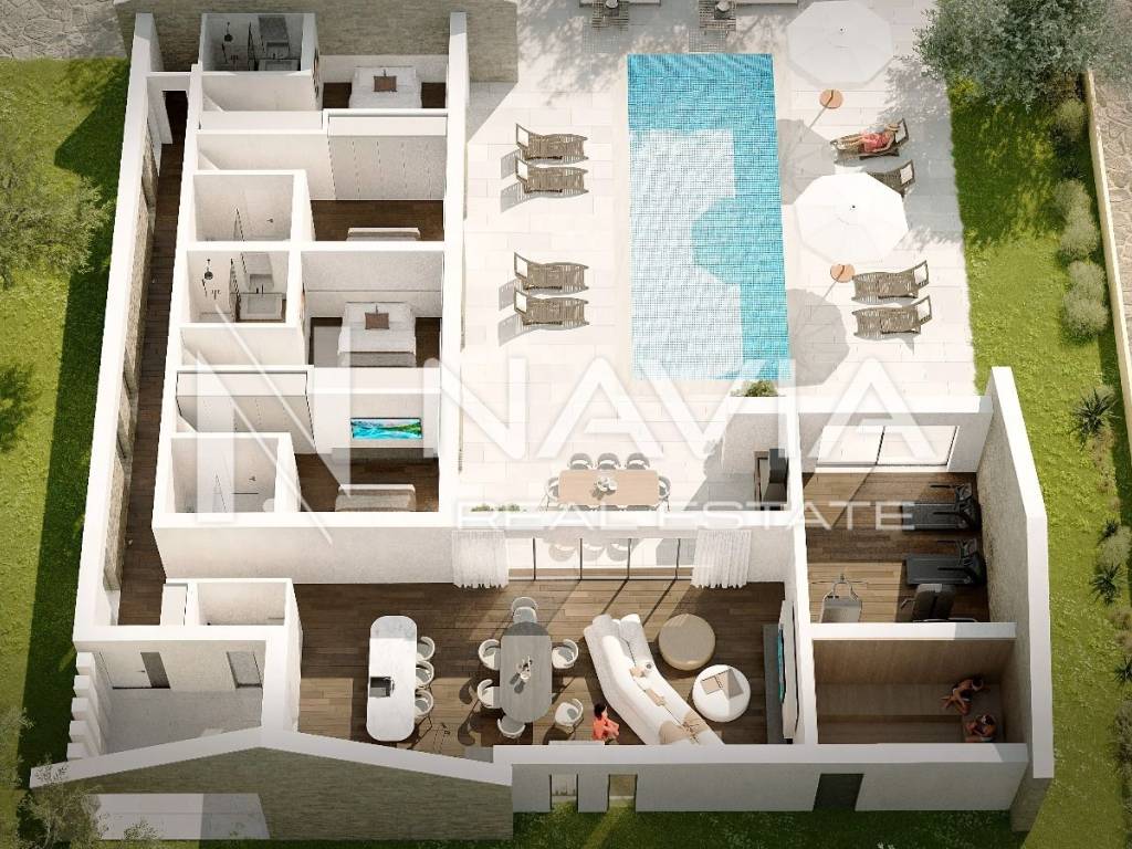 U ponudi je 8 ekskluzivnih, modernih vila, svaka s 225 m² neto stambene površine, smještenih u mirnom i privatnom ambijentu šume, a opet samo nekoliko minuta udaljenih od obale. Lokacija je izuzetno atraktivna: more je udaljeno svega 5 minuta, Zračna luka Zadar samo 15 minuta vožnje, a centar Zadra s bogatom kulturnom i gastronomskom ponudom također je na dohvat ruke – svega 15 minuta.