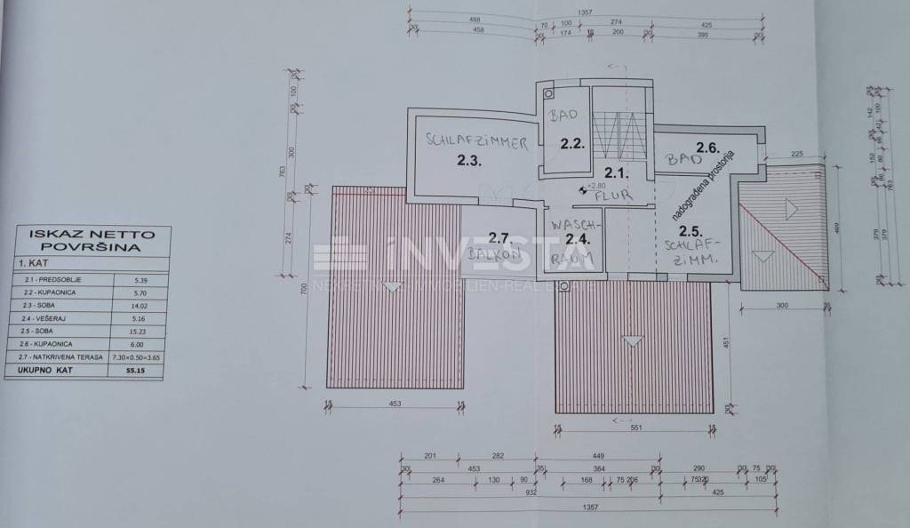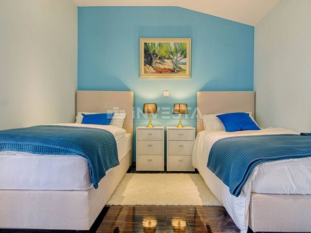 Kat: Dvije spavaće sobe s vlastitim kupaonicama, od kojih jedna ima natkrivenu terasu s pogledom na bazen. Na katu se nalazi i prostor za vešeraj.