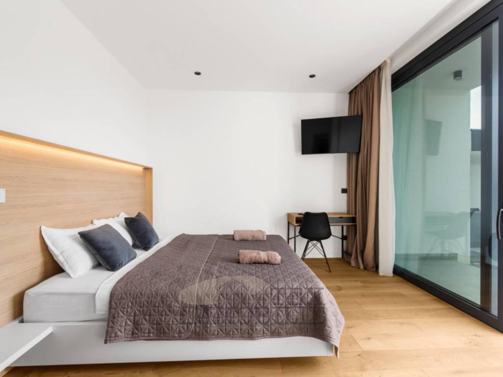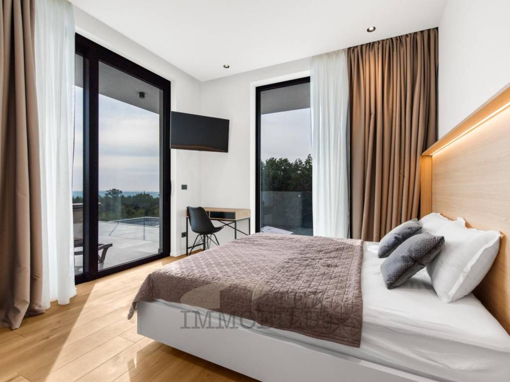 Na katu su smještene tri spavaće sobe, svaka s privatnom kupaonicom. Sve sobe imaju izlaz na zajedničku terasu s prekrasnim pogledom na okolno zelenilo i more.
