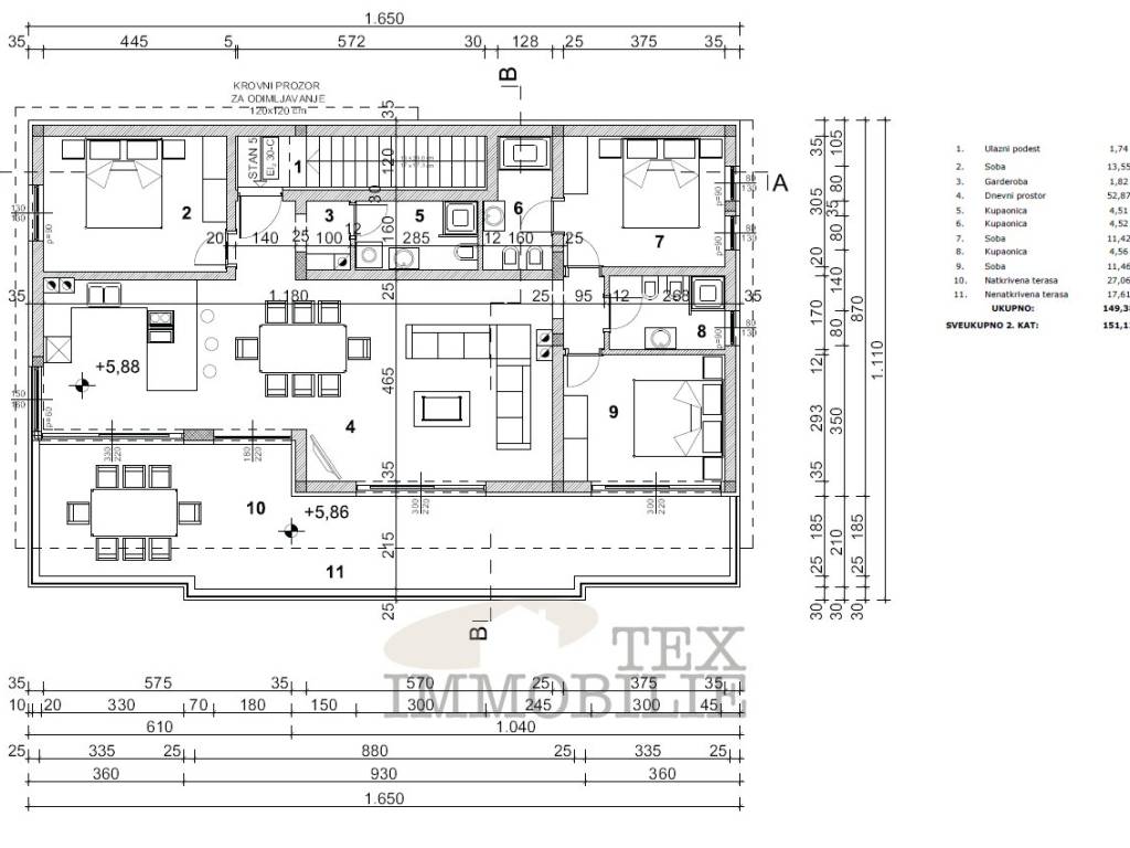Prodaje se luksuzan stan u mjestu Tar, nedaleko od Poreča, na udaljenosti od 3 km od mora. Stan se nalazi na drugom katu moderne zgrade i ima neto površinu od 122 m². Sastoji se od ulaznog prostora, prostranog dnevnog boravka povezanog s kuhinjom i blagovaonicom, tri spavaće sobe i tri kupaonice sa tuš kabinama. Iz stana se izlazi na prostranu terasu s prekrasnim pogledom na more. Za maksimalnu udobnost tijekom cijele godine, stan je opremljen električnim podnim grijanjem i klima uređajima u svim prostorijama. Također, ima priključak na dimnjak koji omogućuje grijanje na drva. Stanu pripada jedno spremište te dva parkirna mjesta. Stan je potpuno namješten i opremljen prvoklasnim namještajem i vrhunskom opremom. Ugrađena je PVC stolarija s troslojnim staklom, te svi prozori i klizne stijene imaju električne rolete. Svaka soba ima indirektnu rasvjetu, čime se postiže ugodna atmosfera. Zgrada ima samo pet stambenih jedinica na izuzetno mirnoj lokaciji.